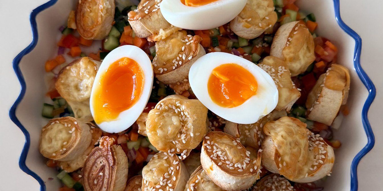 Свіжий салат з рулетиками з тортильї — це поєднання дрібно нарізаних овочів і гарячої сирної закуски в одній страві. Салат готується з огірків, томатів і цибулі, які заправляються оливковою олією і лимонним соком. Рулетики з тортильї запікаються до рум’яної скоринки: сир всередині плавиться, а краї стають хрусткими. У результаті виходить легкий, але збалансований корисний салат на щодень.