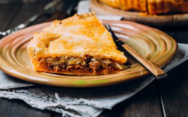 Змастіть верх пирога збитим жовтком та проробіть невеликі отвори, щоб випаровувалась зайва волога.
