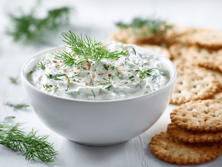 У мисці з’єднай грецький йогурт, подрібнений кріп або базилік (можна сушені), сіль і краплю олії. Використовуй це як дип для нарізаних огірків, моркви чи крекерів — корисно і ситно.