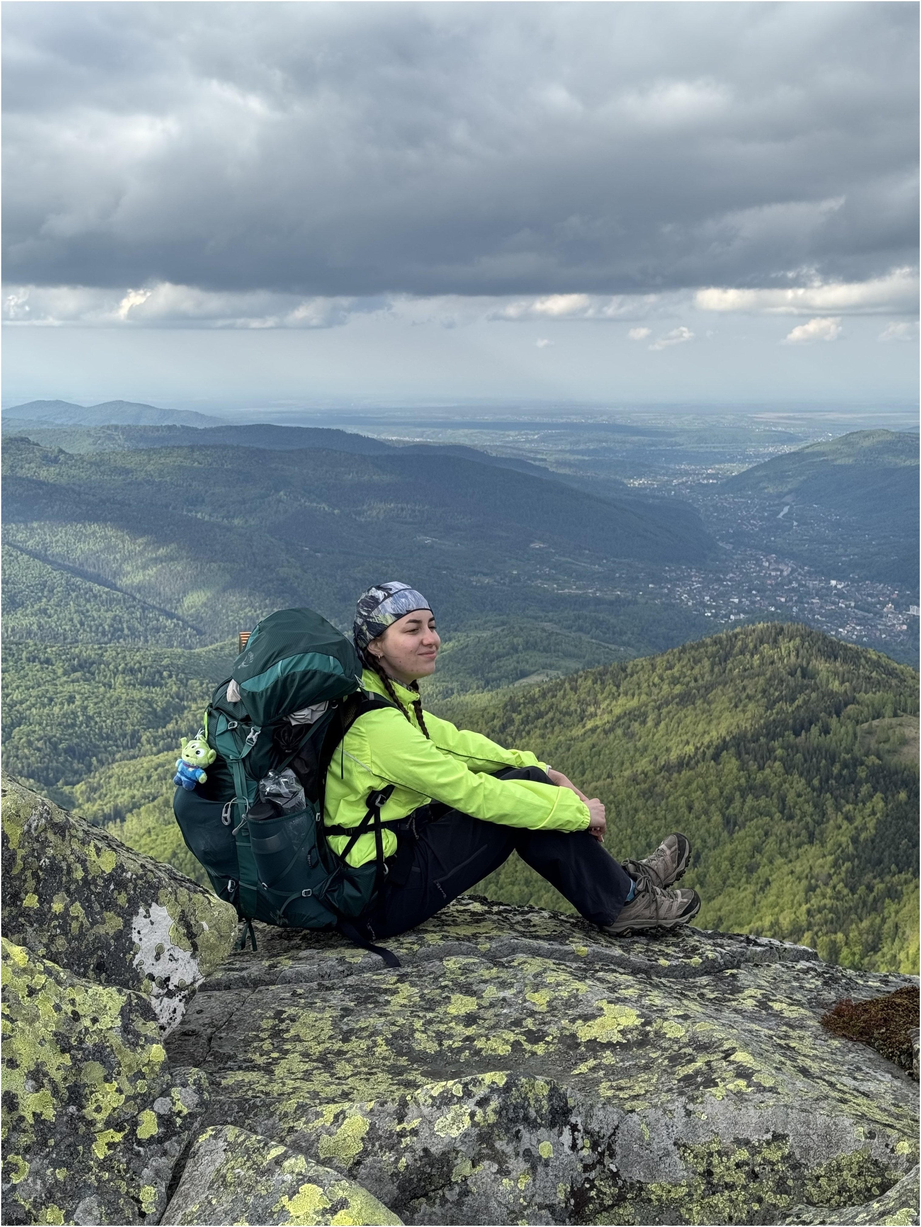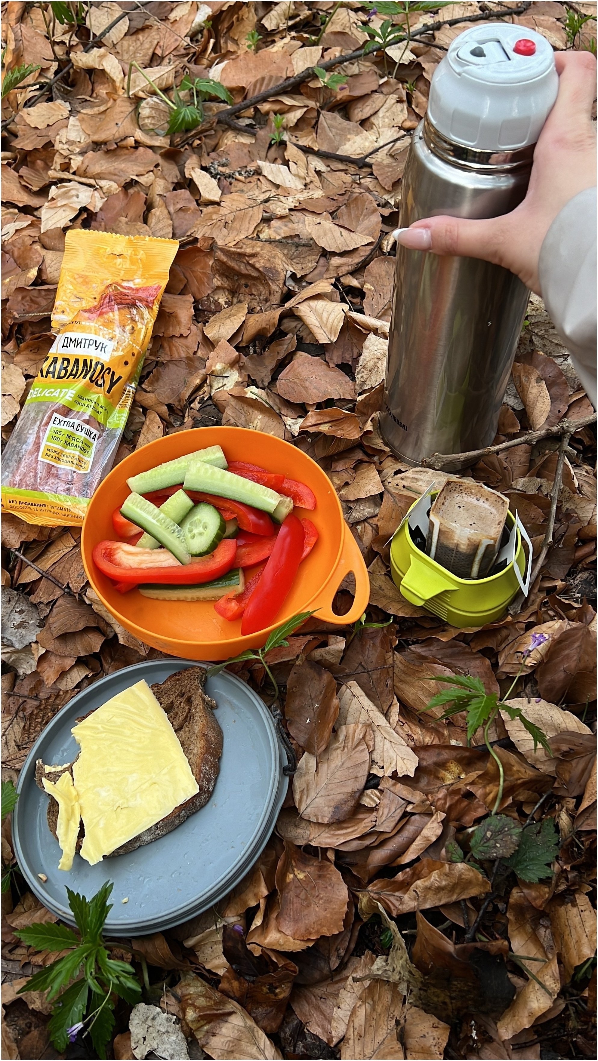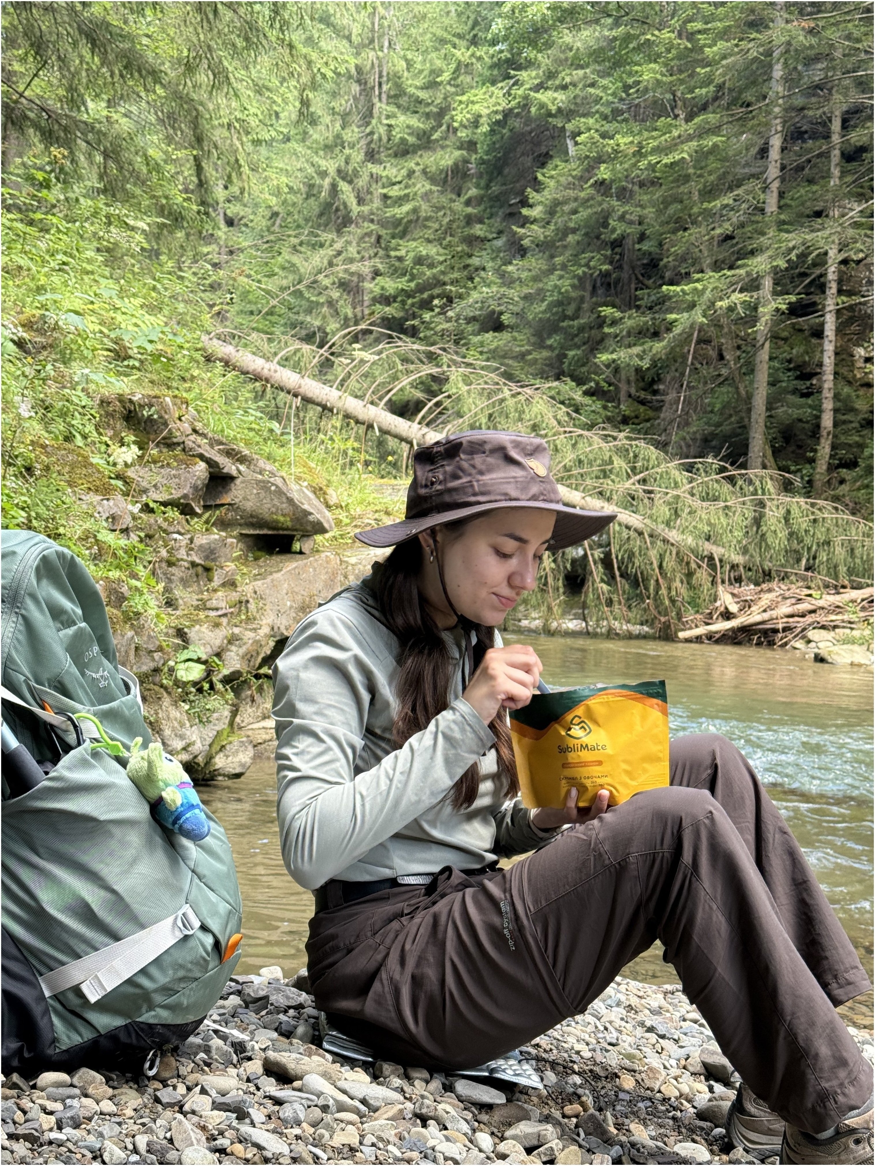 У походи я ходжу активно з липня 2024 року. У мене є певний список улюблених субліматів, і, якщо це одноденний похід, я беру одну пачку з ними та перекуси. Якщо планується ночівля, тоді на один день я беру 3 пачки субліматів, декілька батончиків із сухофруктами та щось солодке. Щодо перекусів, то в мене це батончики із сухофруктів, кабаноси, люблю дуже сухарики із зеленню. Ще підсіла на желейки.
