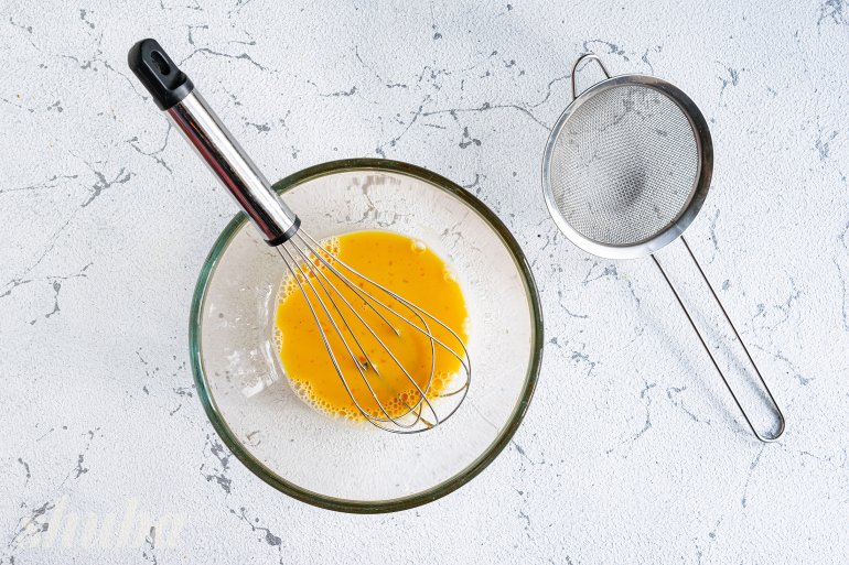 У окремому посуді збий яєчні жовтки цесарки. Постійно помішуючи інгредієнти вінчиком, влий до жовтків уварену суміш. Постав миску на водяну баню. Постійно помішуючи, доведи соус до загустіння.