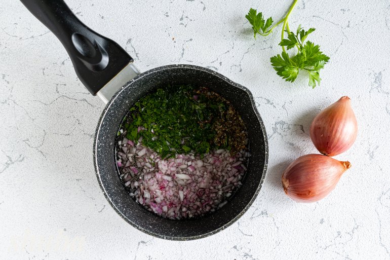 У ківш додай дрібно нарізану цибулю шалот, подрібнений естрагон та петрушку. Влий білий винний оцет і сухе вино, перемішай. Готуй суміш на середньому вогні, доки рідина не випарується вдвічі. Пропусти рідину через сито, остуди до кімнатної температури.