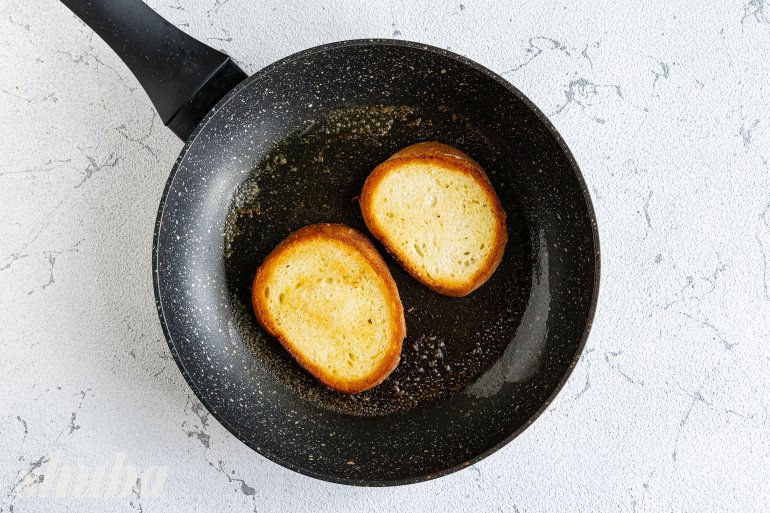 На сковороді розтопи 20 г вершкового масла. Виклади скибочки хліба. Обсмаж його з двох боків на середньому вогні до золотавої скоринки.