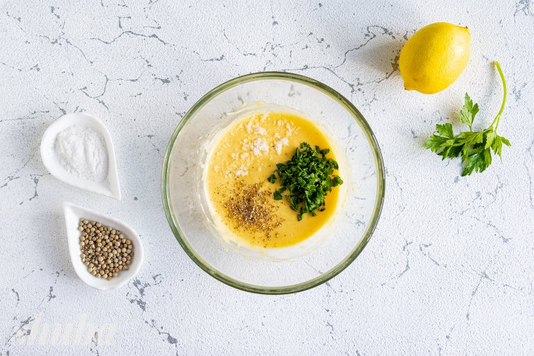 Коли соус загусне і набуде кремоподібної консистенції, повільно влий у нього розтоплене вершкове масло, постійно помішуючи. Додай дрібно нарізану зелень петрушки, лимонний сік, сіль та білий перець за смаком.
