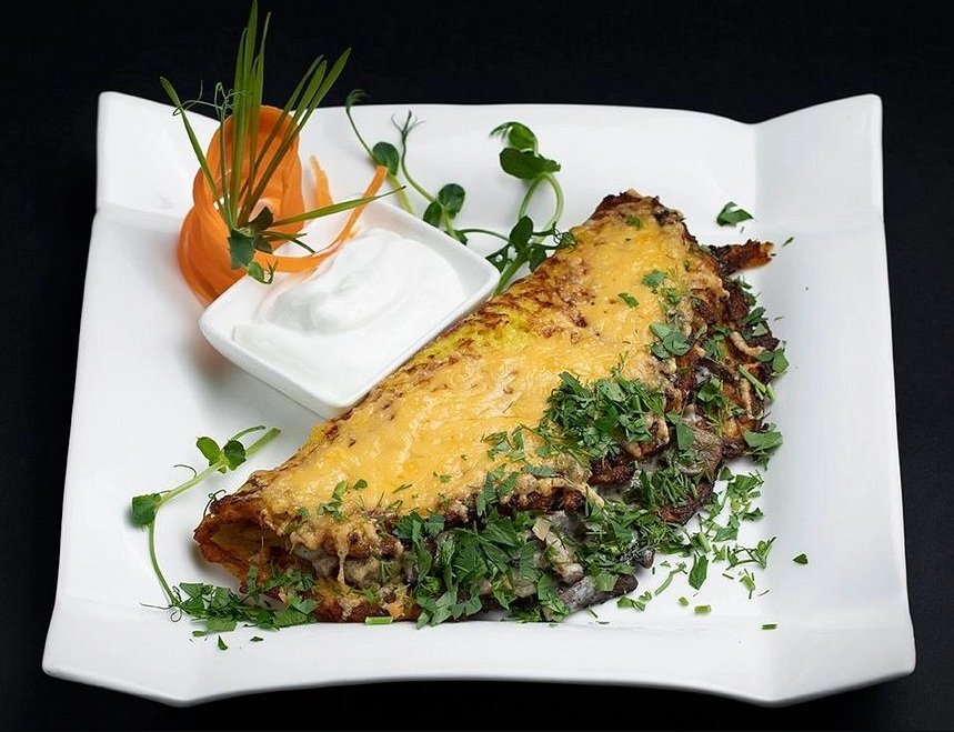 Якщо ж полюбляєш гриби, неодмінно замовляй великий дерун із жульєном та вершковим соусом. Він не лише ситний та апетитний, а й має ніжний смак завдяки вершкам. Подається зі сметаною, тертим сиром та зеленню.