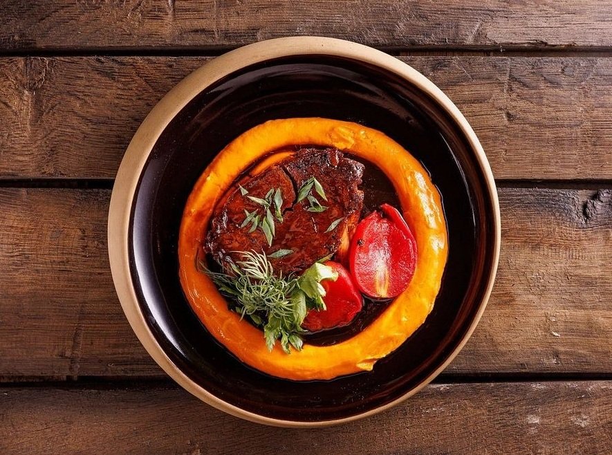 Якщо любиш поживні м’ясні страви, Буковель також може тебе вразити. Наприклад, спробуй мангалицю. Це соковита фермерська свинина, томлена в житньому квасі. Викладена на подушку з морквяно-кремового пюре та прикрашена ароматними травами, вона точно буде чудовим вибором для вечері після дня в дорозі.