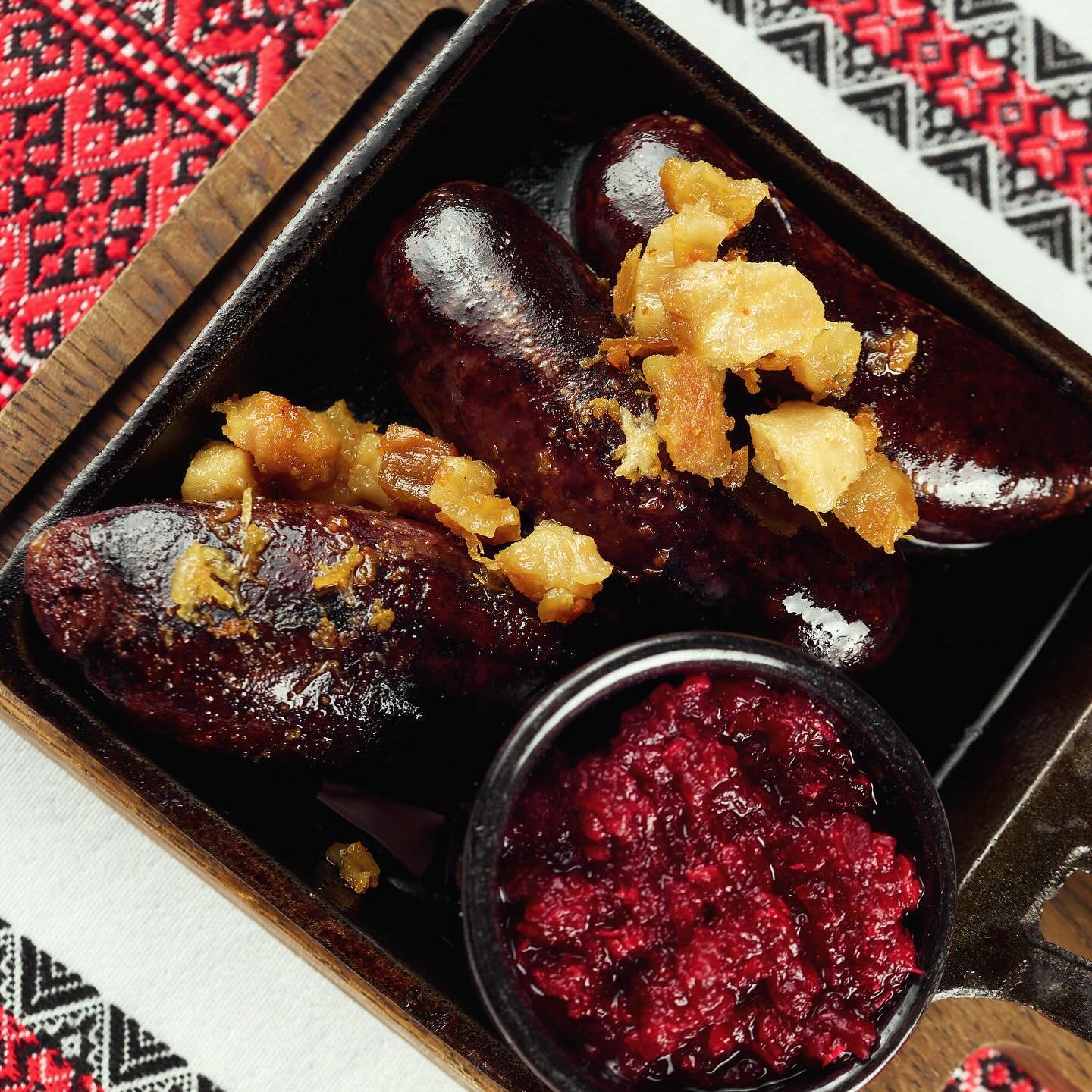 Страва, яку готують в Карпатах століттями — кров’янка. Соковита домашня кров’яна ковбаса за традиційним рецептом в поєднанні з пікантними соусами подарує тобі справжній смак Карпат.