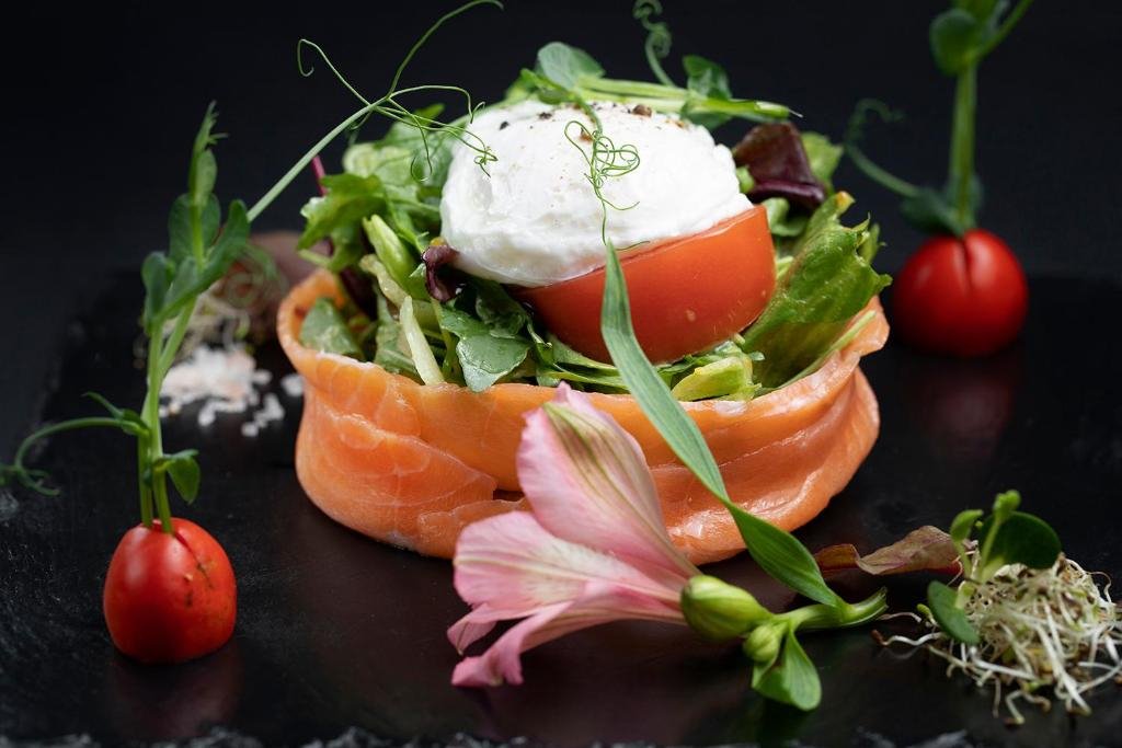 Ось, наприклад, дерун з міксом салатів, загорнутий в лосось, з томатом, каперсами, чері та яйцем пашот. Слабосолений лосось дарує ніжний смак, а каперси додають пікантності.