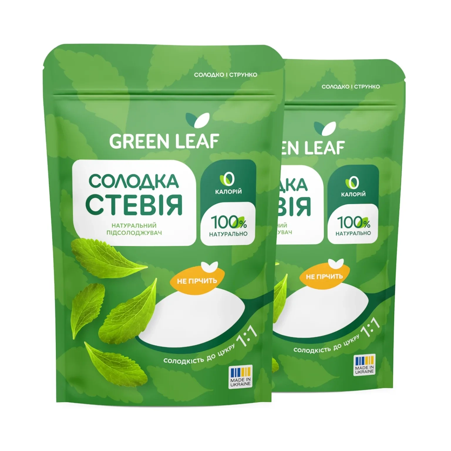 Український бренд Green Leaf спеціалізується на створенні натуральних солодощів і допомагає готувати корисні десерти без цукру. У складі лише натуральні інгредієнти, без синтетичних добавок чи підсилювачів смаку. Виробник пропонує класичний варіант і з ароматом ванілі. Доступні варіанти з різною концентрацією солодкості: 1:1 — коли рівень солодкості дорівнює цукру, 1:4 — стевія вчетверо солодша за цукор.
