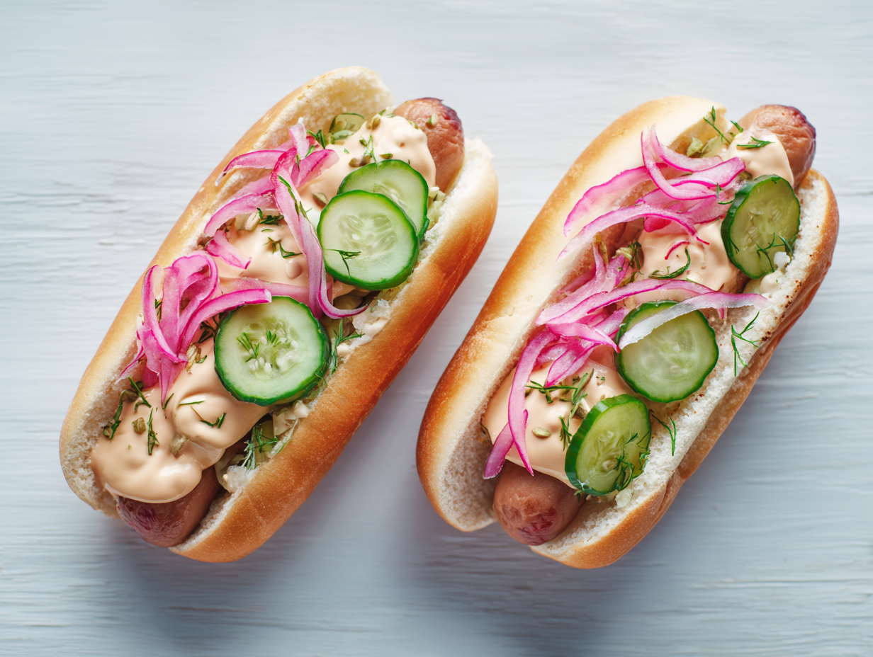 Змішай майонез із соусом чилі — вийде пікантний соус. Сосиски підігрій у воді або на сковорідці (можна пропустити цей крок, якщо вони копчені). Розріж булочки, намасти соусом. Додай сосиску, овочі та мариновану цибулю. Подавай одразу.