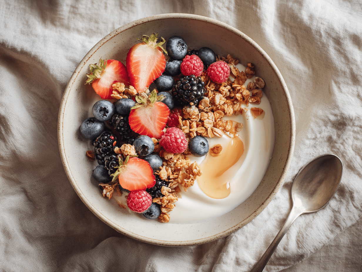 Виклади густий йогурт у глибоку миску. Додай гранолу. Наріж фрукти або додай ягоди. Вони можуть бути свіжі чи розморожені. Полий медом або кленовим сиропом. Насип трішки горіхів чи насіння для текстури.