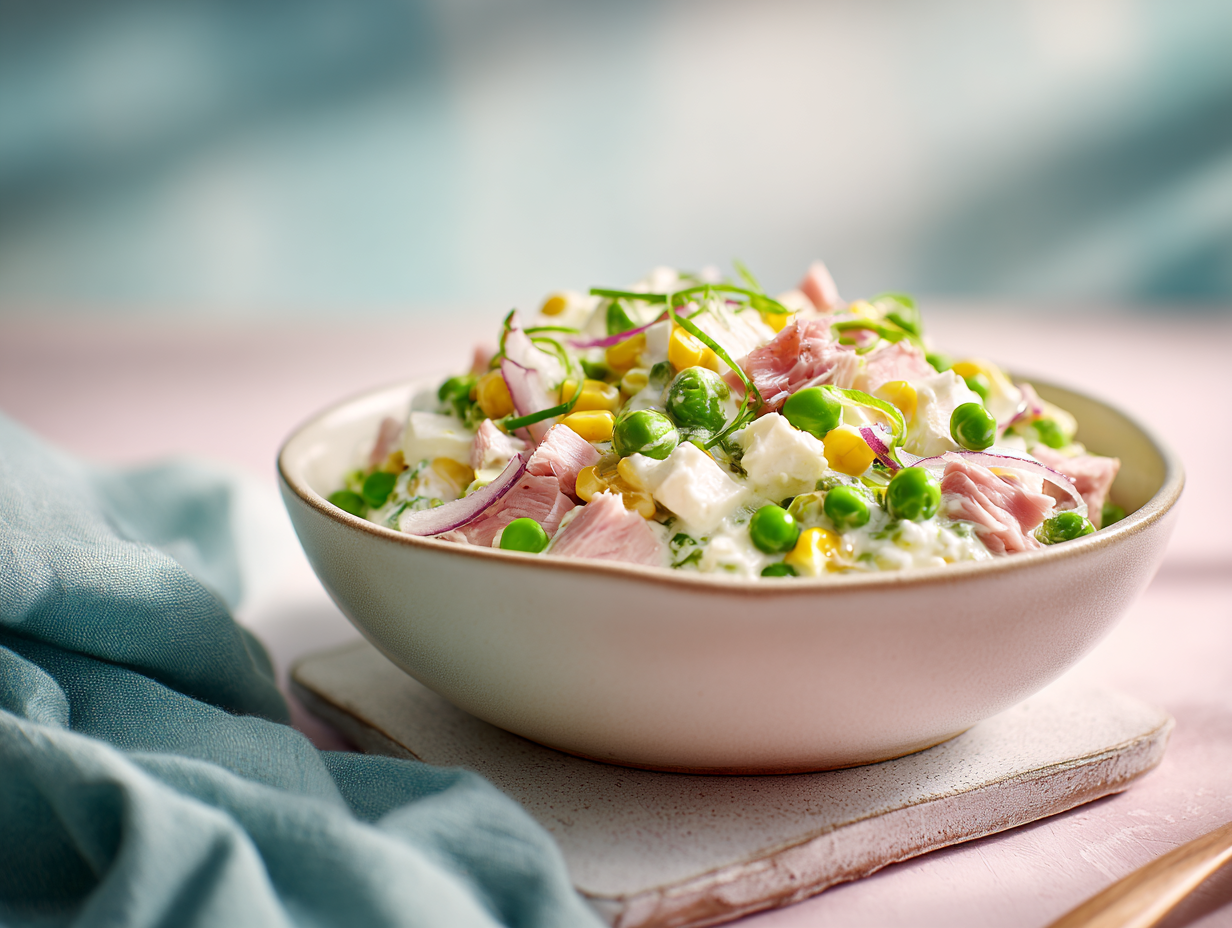 Страва без термообробки та без будь-яких гаджетів. Усе, що треба — відкрити консервовану кукурудзу і горошок, нарізати копчену курку та змішати. Готується за 10 хвилин і насичує на весь день.
