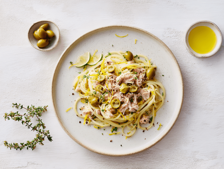 Відвари пасту до стану al dente (вари на 1-2 хв менше, ніж вказано на упаковці). Поки вариться паста, змішай в мисці тунець, нарізані оливки, оливкову олію, цедру та лимонний сік. Додай подрібнений часник, якщо любиш. З’єднай пасту із соусом, перемішай і подавай.