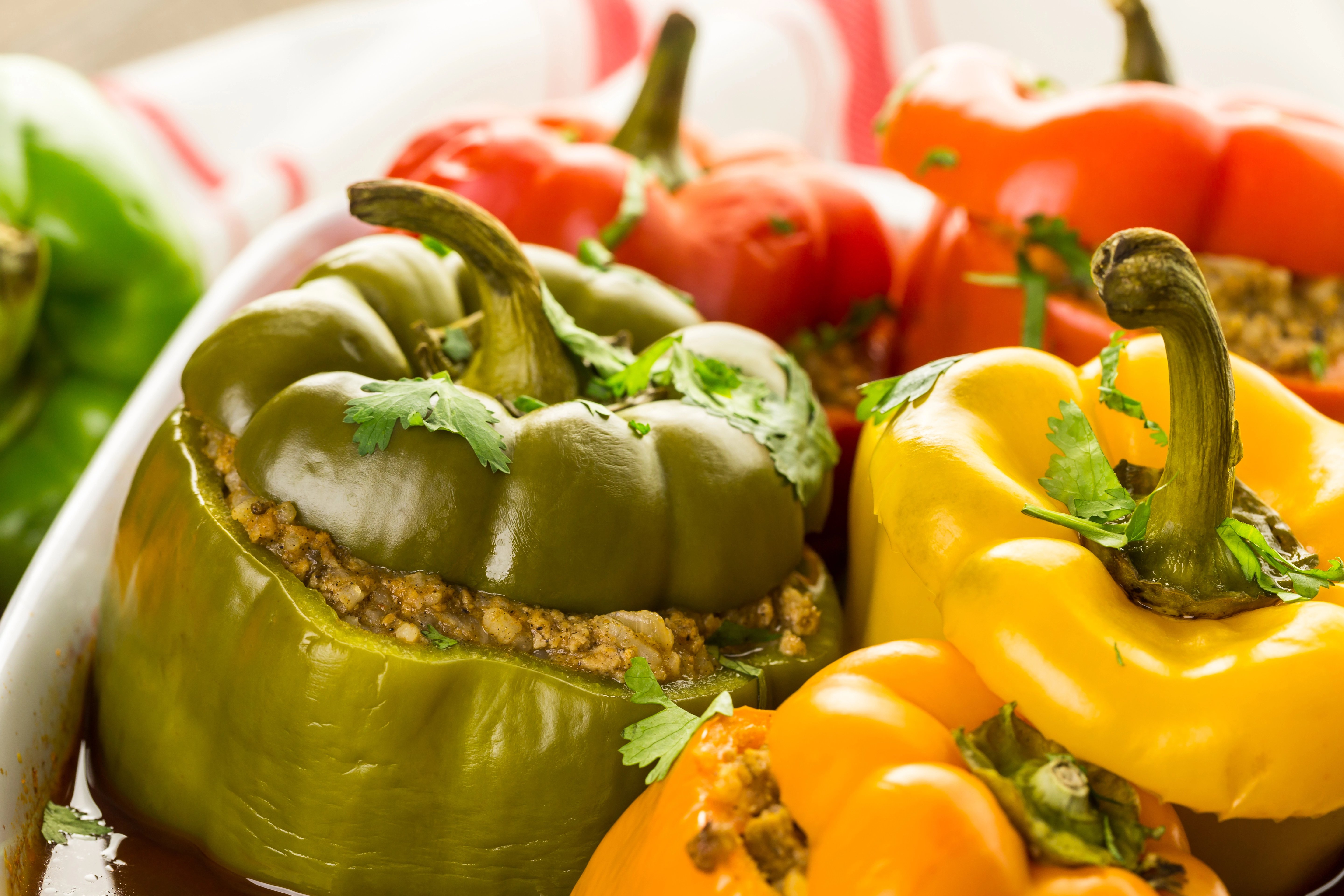 4. Перці розріж навпіл, видали серцевину. Начини її сумішшю овочів з кіноа та спеціями.