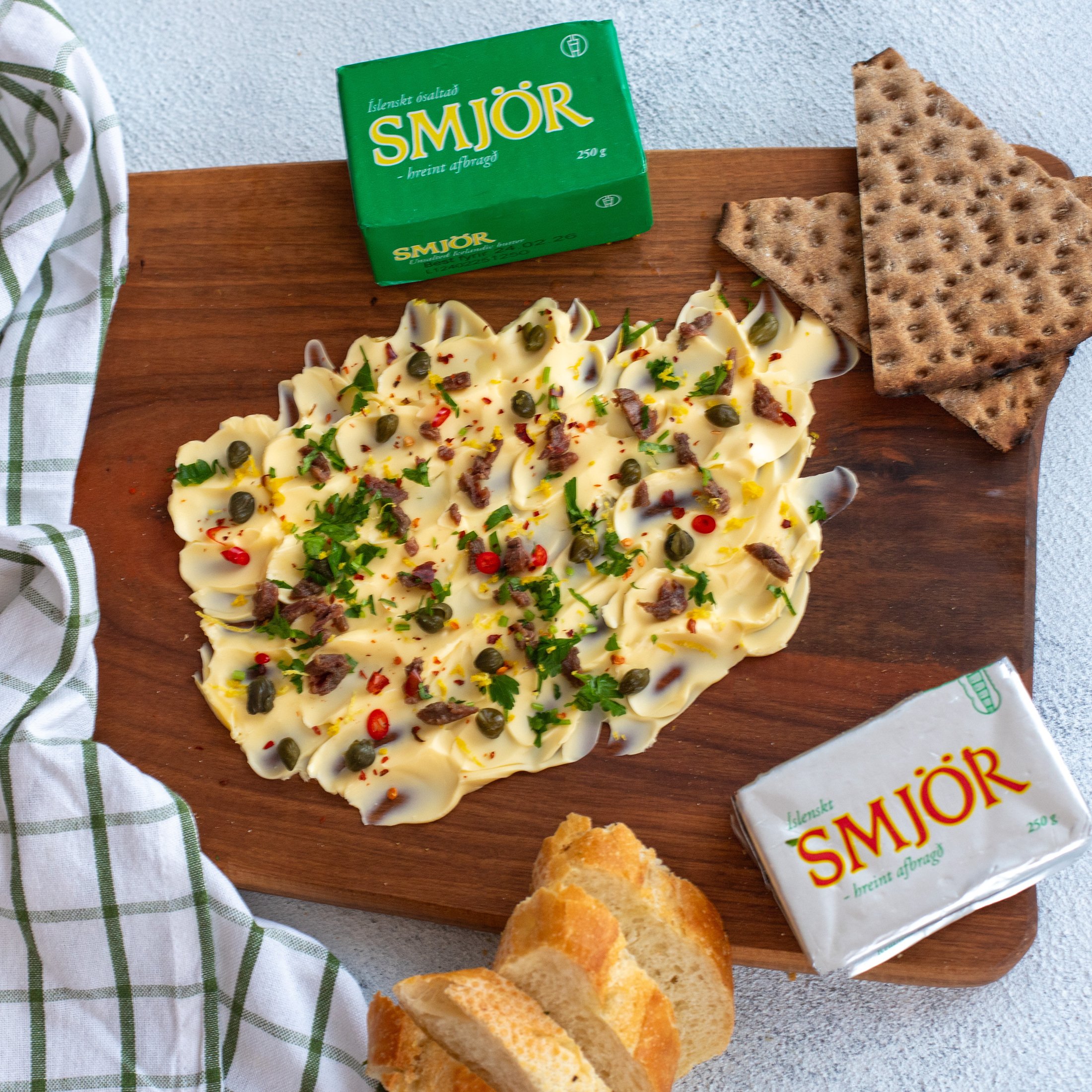 Ми використали це масло для трендової масляної дошки, поєднавши з каперсами, пластівцями чилі, зеленню та лимонною цедрою. У масло додали анчоуси, бо Скандинавія — це передусім риба, як не крути. Поруч — скандинавські житні хлібці та багет.