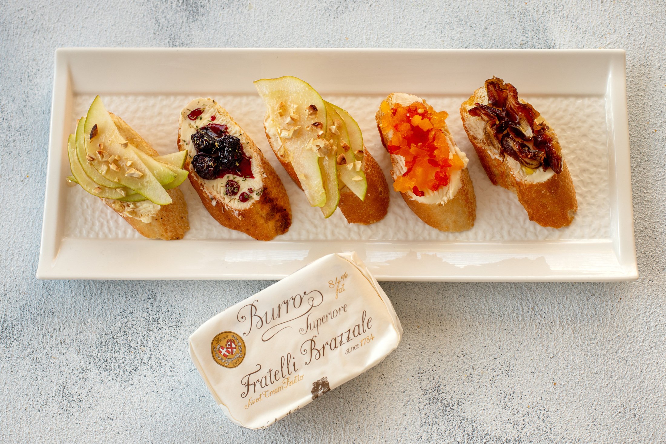 Fratelli Brazzale Burro Superiore 84% — це зовсім інший характер. Вища жирність дає щільнішу текстуру і більш насичений, глибокий смак. Це масло добре тримає форму й не губиться навіть поруч із яскравими акцентами. З ним ми спробували: