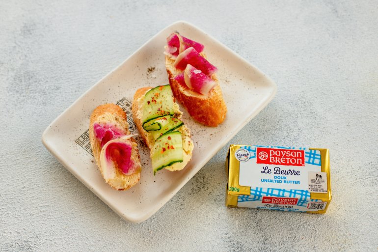 Paysan Breton 82% ми використали для зовсім іншого настрою — канапок з хрумкими овочами. Це масло з Бретані, Франція, яке має чистий, добре збалансований вершковий смак без різких нот, тому підходить для практично всіх поєднань.