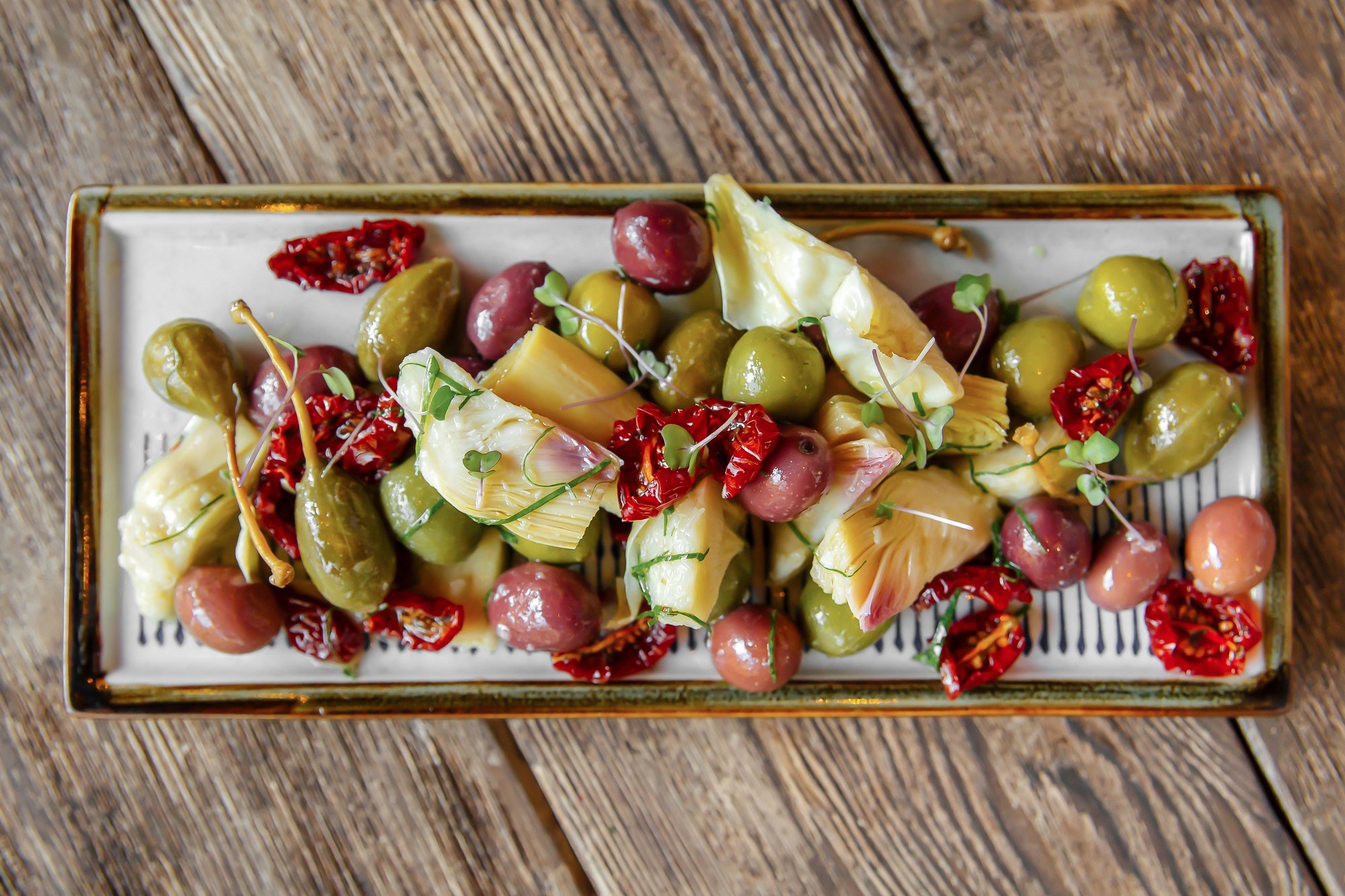 Викладіть у центр великої тарілки фету чи кульки моцарели, щедро поливши їх оливковою олією та посипавши сухими травами для аромату. Навколо сиру розмістіть невеликими групами зелені й чорні оливки, в’ялені томати, маринований перець, гриби або артишоки, а також великі каперси. Поруч розкладіть скибочки свіжого багета, хлібці або чіабату, щоб кожен міг самостійно створювати улюблені комбінації