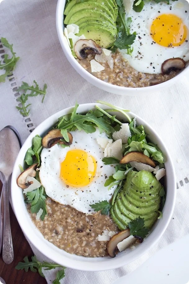 Вівсянка з авокадо, грибами, яйцем та руколою