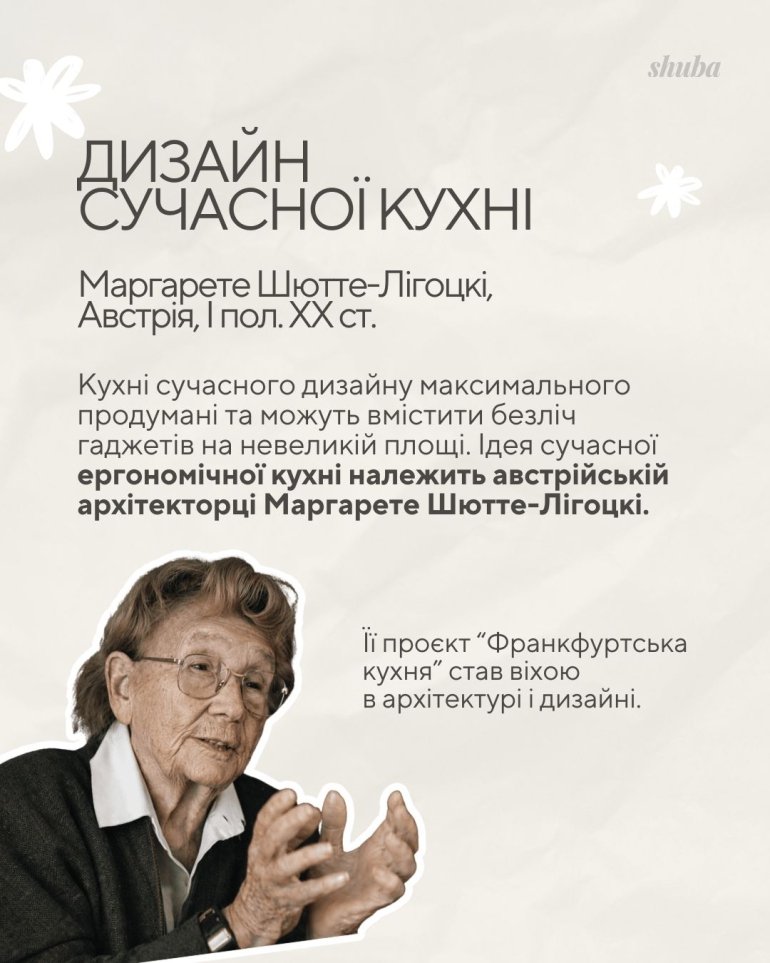 Австрійська архітекторка Маргарете Шютте-Лігоцкі розробила принципово новий дизайн кухні для Дрездена. Вона створила продуманий простір, де кожен сантиметр працював на зручність.