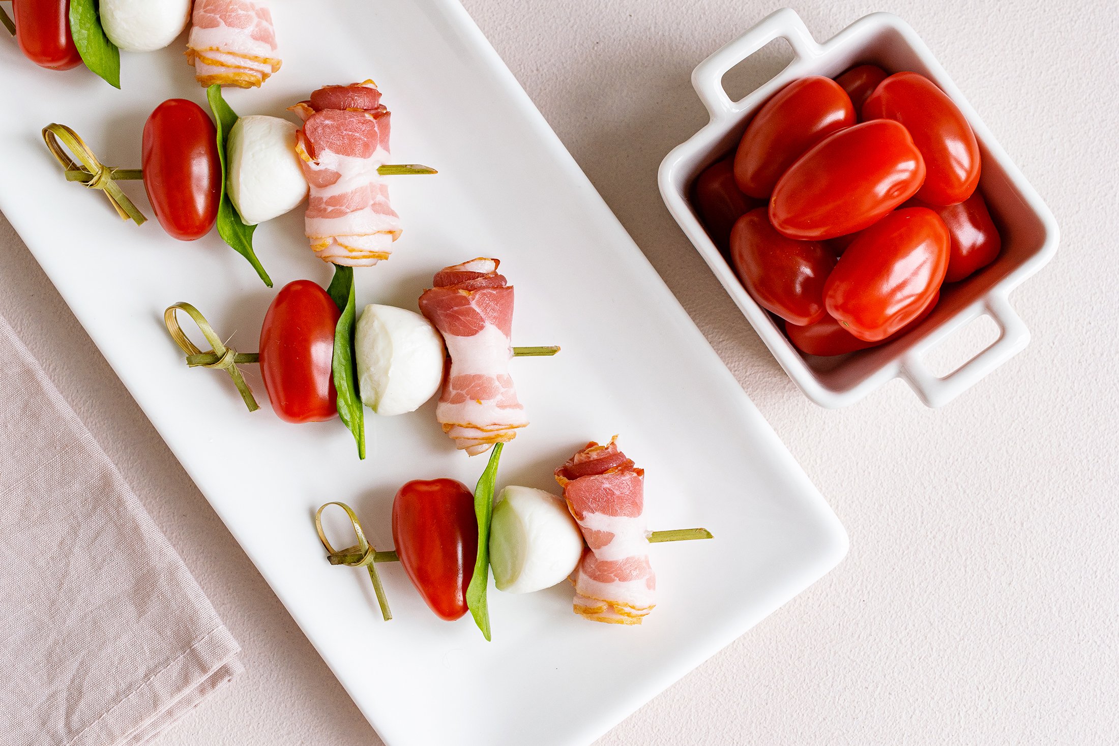 - На шпажки нанизуй томати, базилік, моцарелу і бекон.