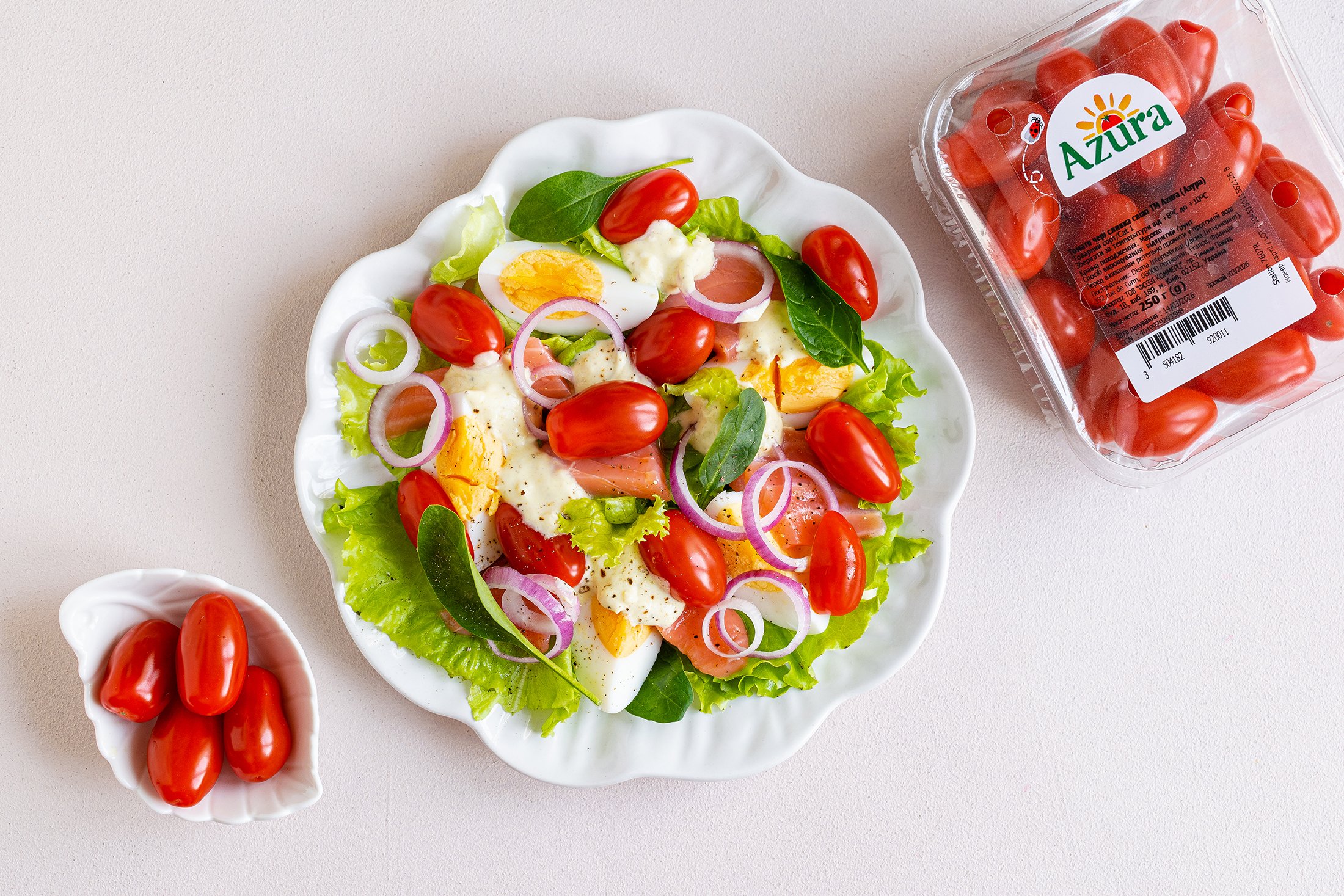 Салат із червоною рибою, яйцем і томатами