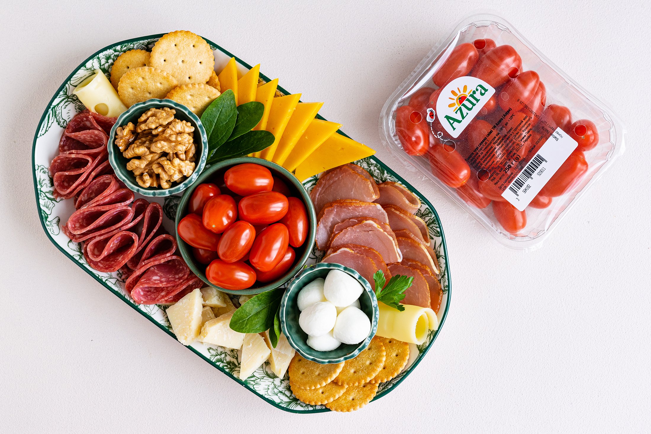 - Навколо красиво розклади салямі, копчене м’ясо, сири та крекери.
