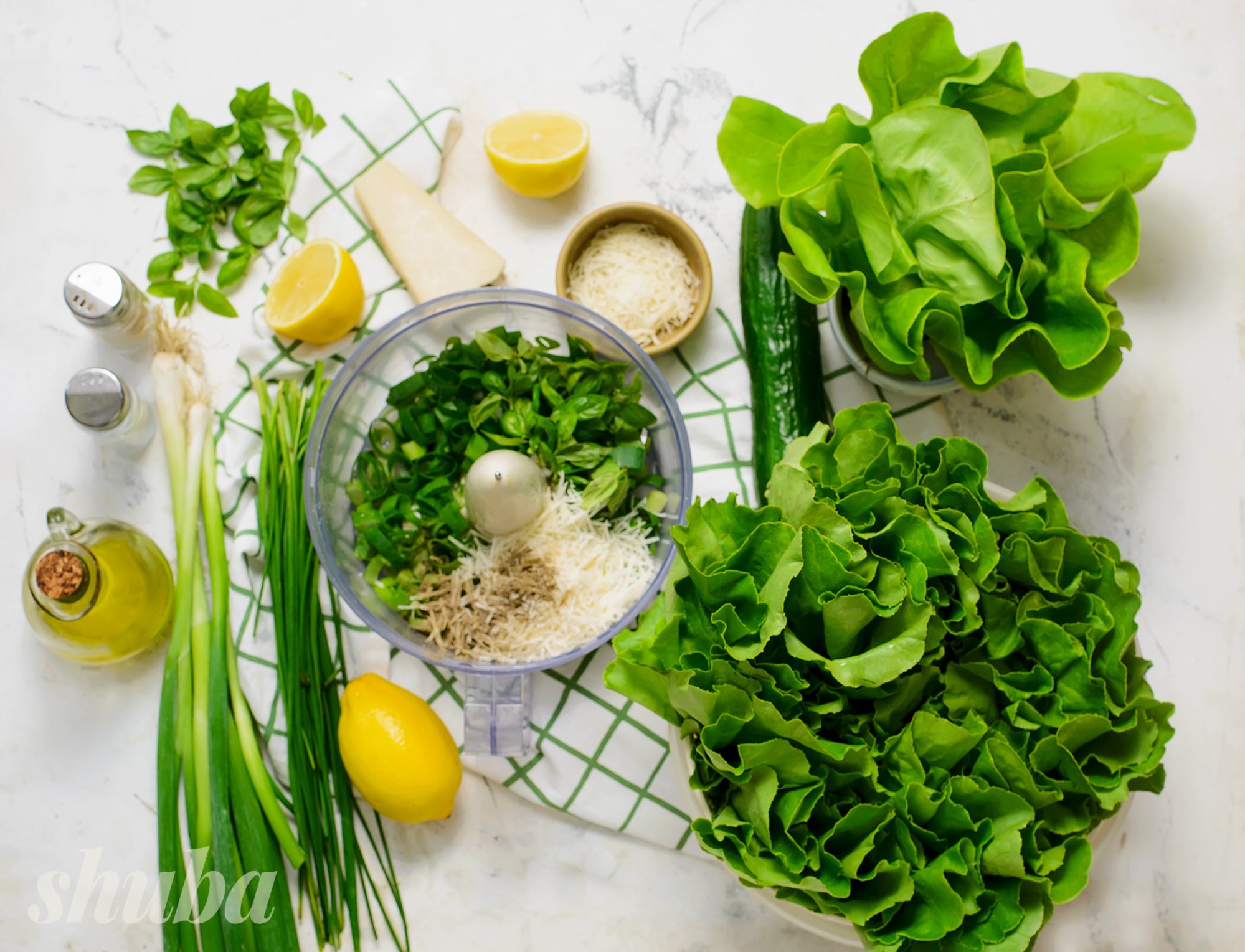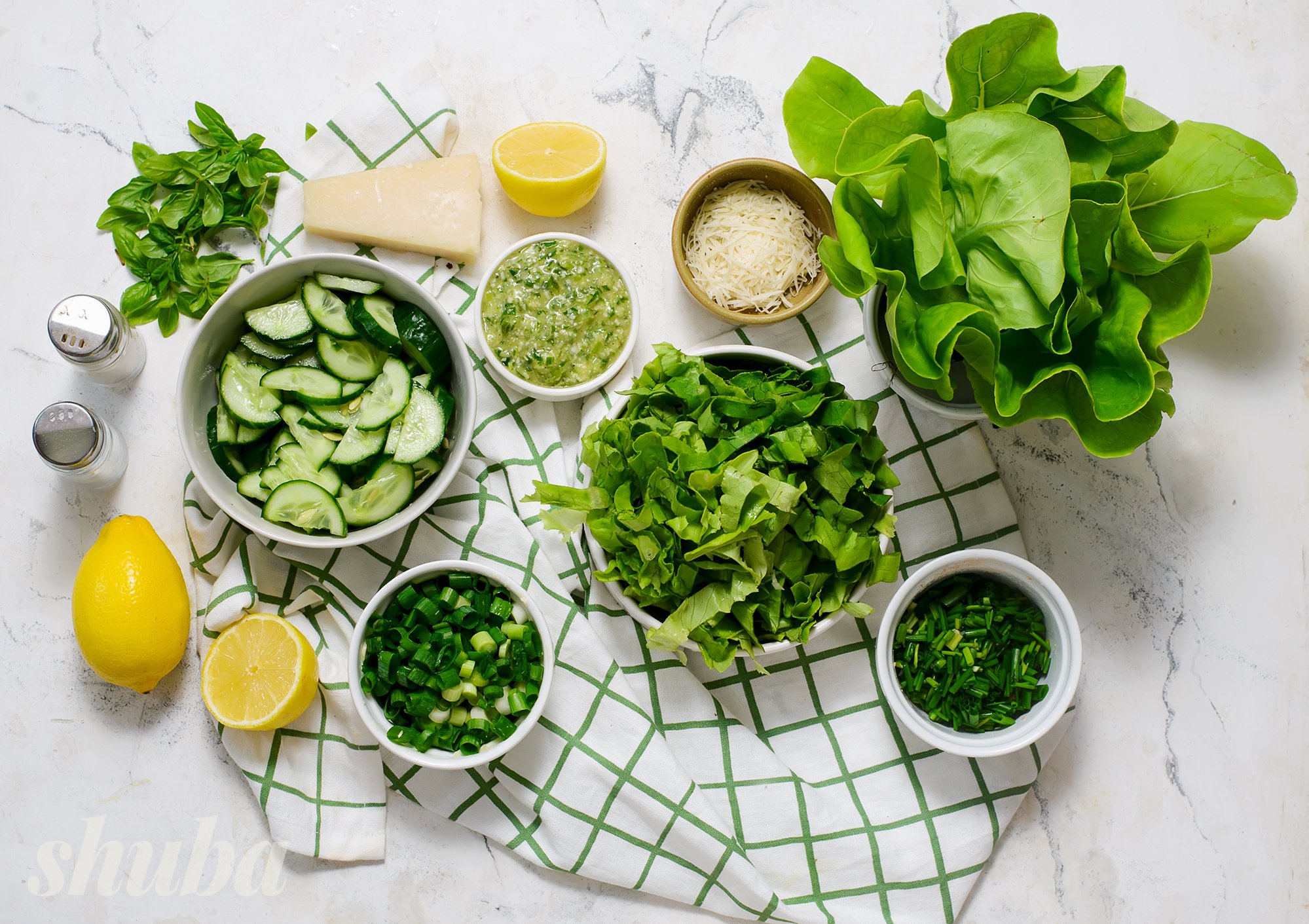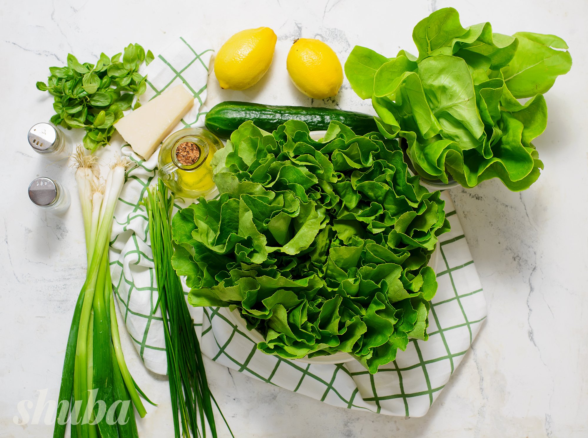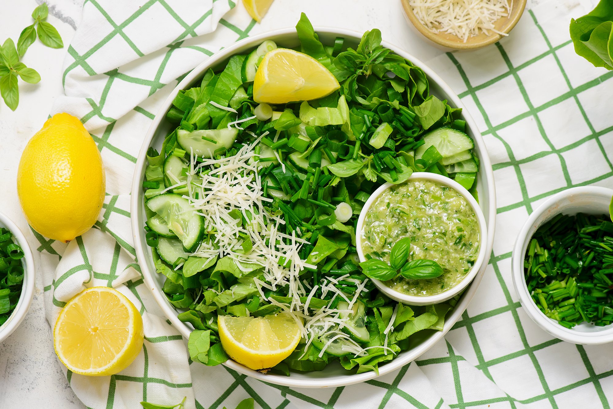 Зелений салат з кремовою заправкою — легка та вдала закуска до основних страв. Він готується з доступних продуктів: свіже листя салату, огірки та зелена цибуля. Поєднання пармезану та оливкової олії робить заправку ніжною та кремовою, а додаткові смакові нотки дарують базилік, лайм, цибуля, часник та зелена цибуля.