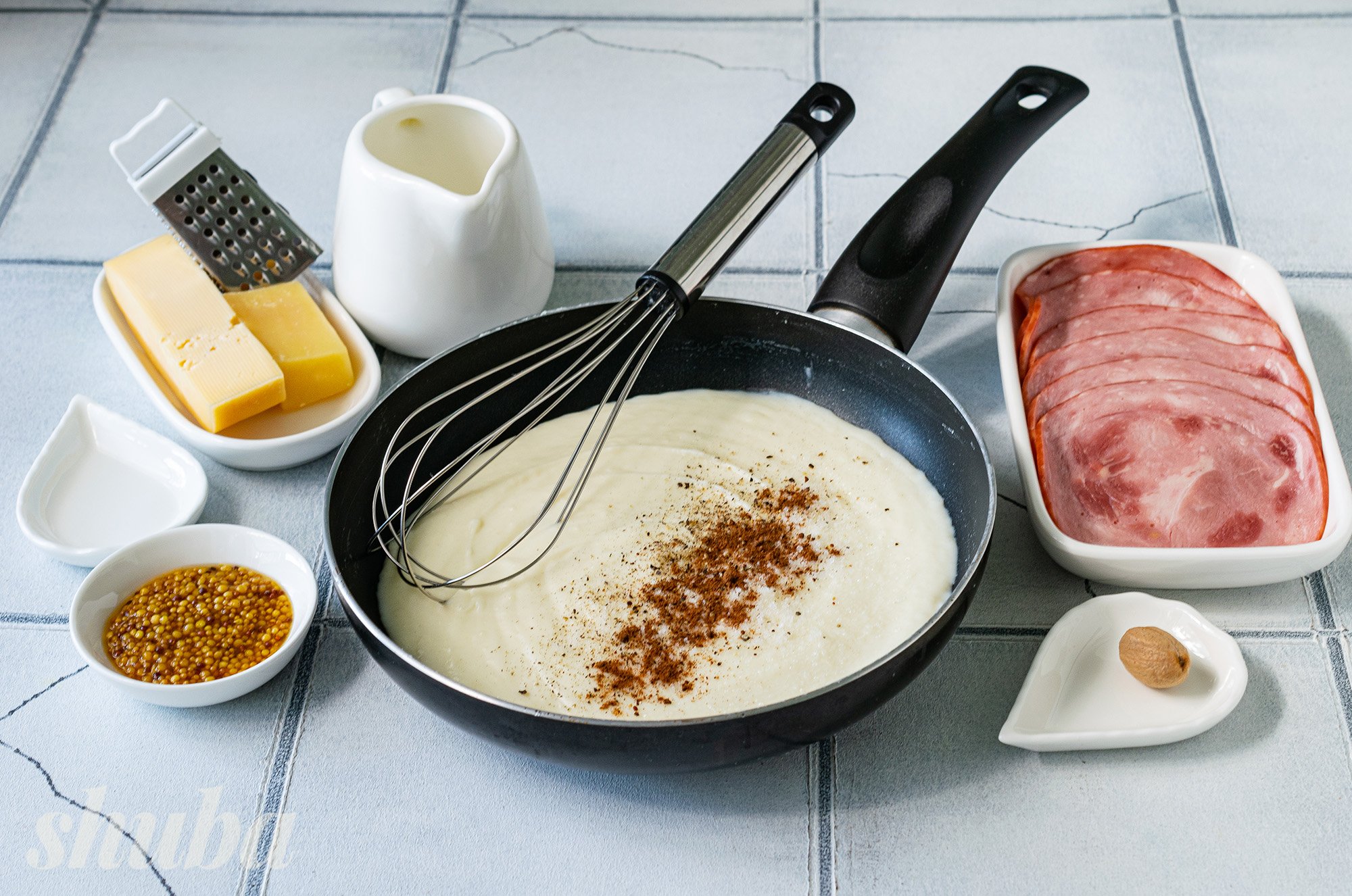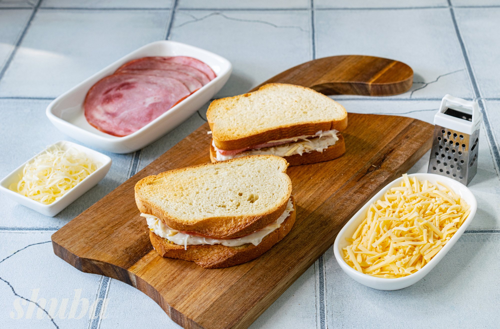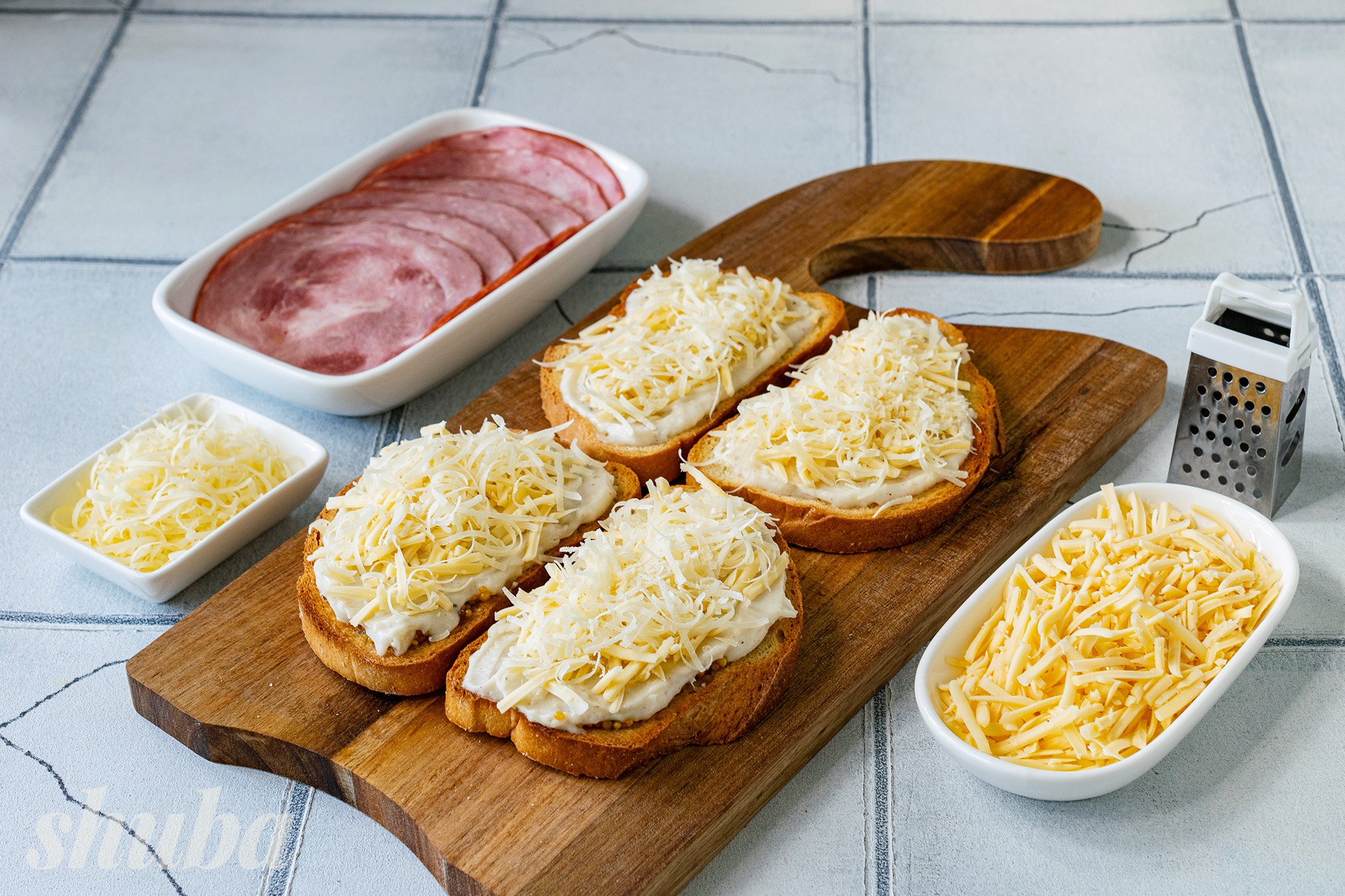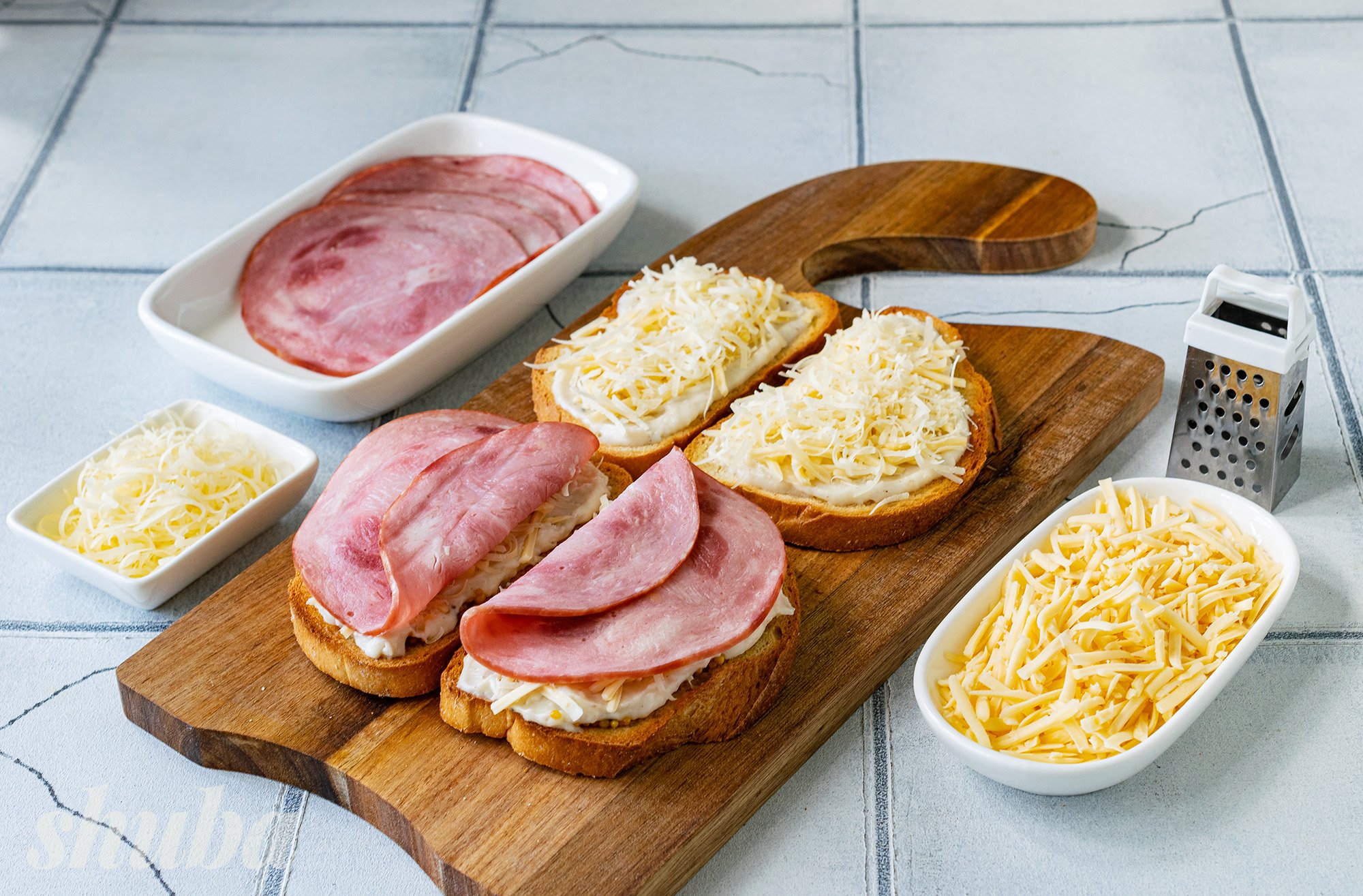 У нашій версії крок-месьє ми використовуємо 4 тонкі шматочки (слайси) шинки, сири емменталь та пармезан. Додаємо і соус бешамель, який приправляємо мускатним горіхом для аромату.