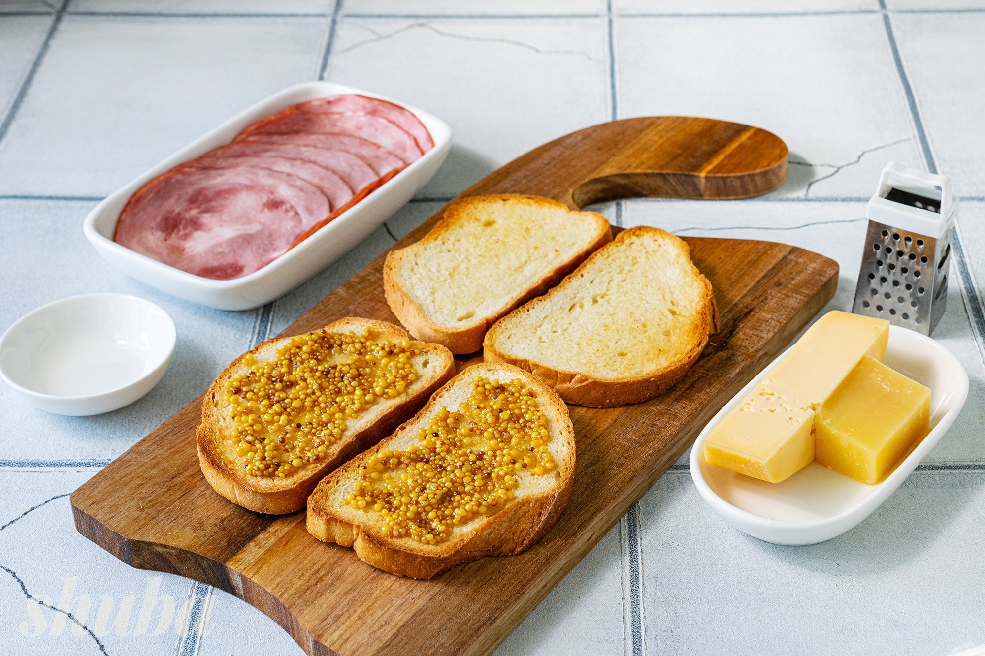 Розподіли тонкі слайси шинки на дві скибочки з гірчицею.