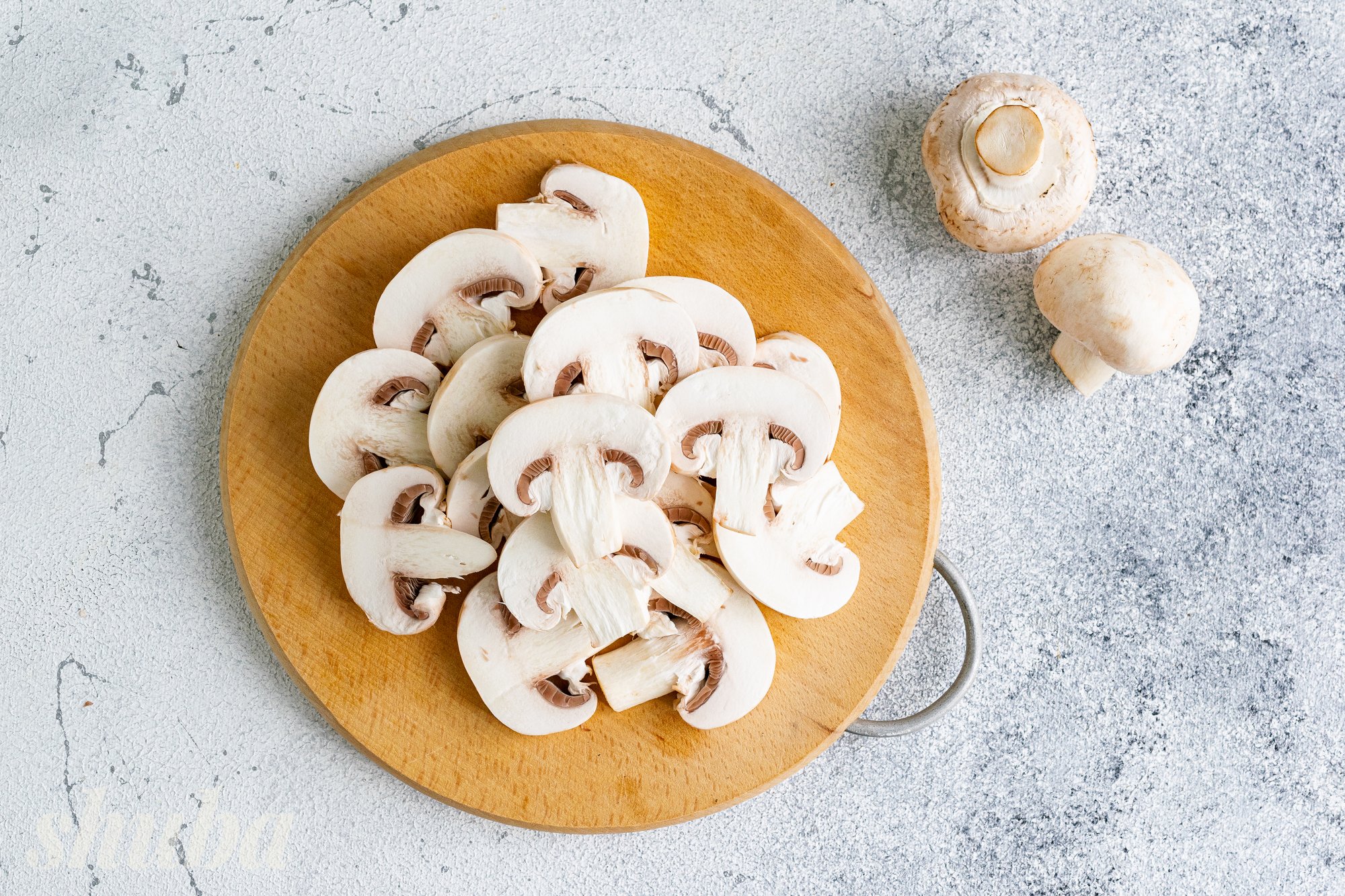 Свіжі печериці помий, наріж слайсами завтовшки 3-4 мм.
