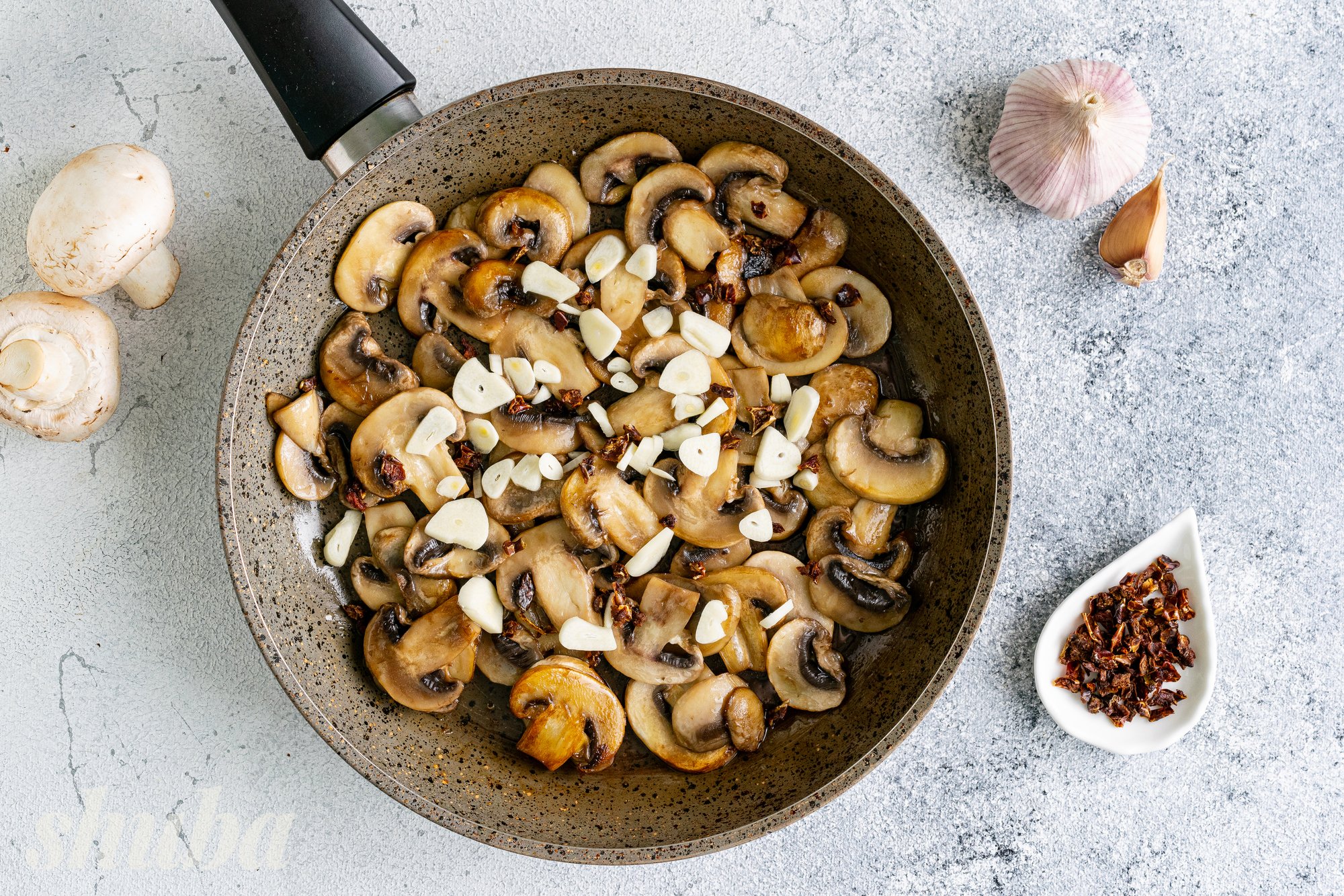 Зубчики часнику очисти від лушпиння, наріж тонкими слайсами, додай до печериць. Для пікантності всип сушені пластівці перцю чилі. Якщо не любиш гостре, цей крок можна пропустити.
