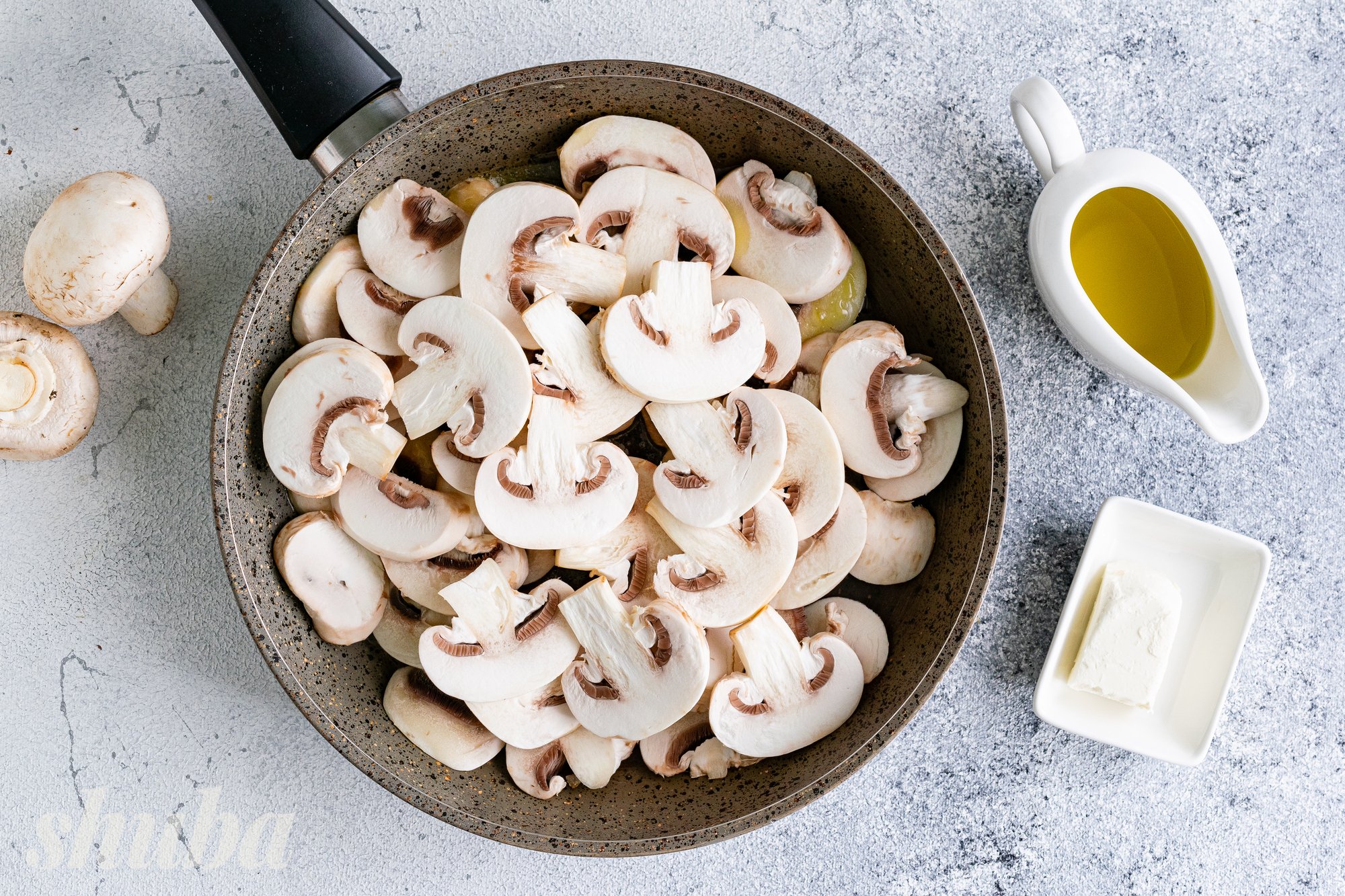 На сковороді змішай вершкове масло та оливкову олію. Коли суміш розігріється, виклади в неї нарізані печериці. Помішуй та обсмажуй гриби на сильному вогні до золотистого відтінку.