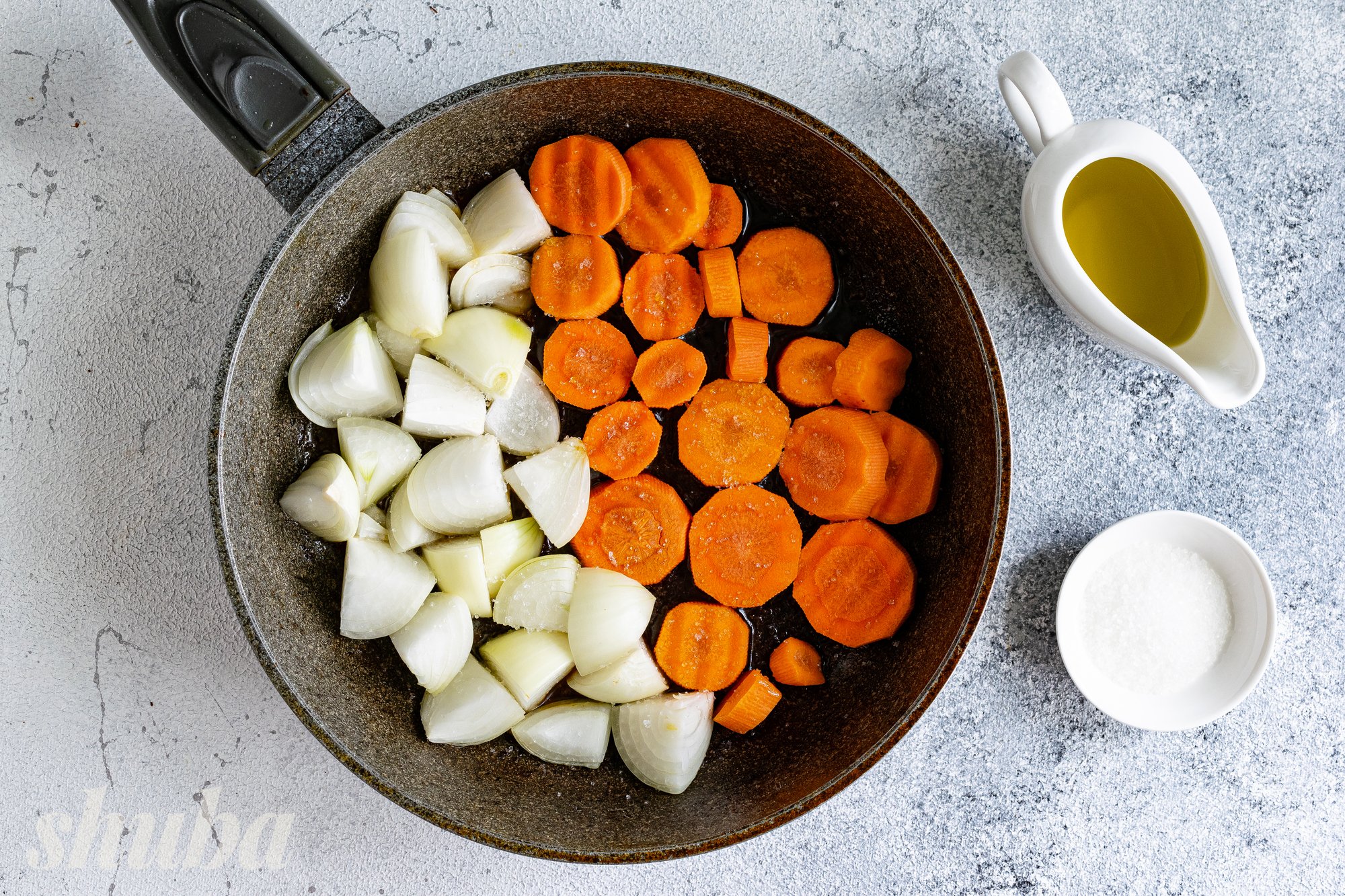 На сковороду, в якій смажилося м’ясо, виклади цибулю та моркву. Додай чайну ложку цукру, щоб овочі краще карамелізувалися. Помішуй та обсмажуй цибулю з морквою на середньому вогні до золотистого відтінку.