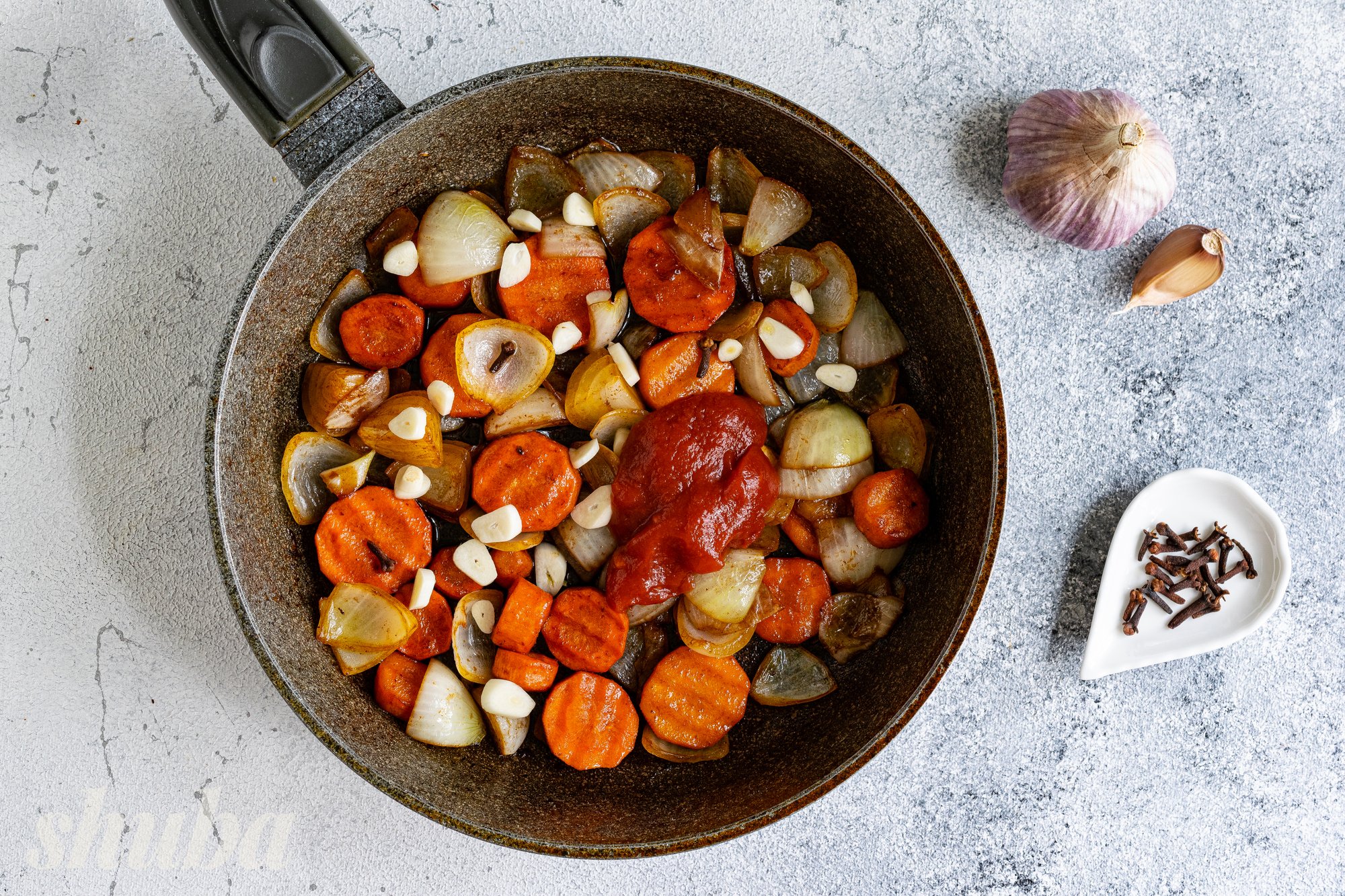 5/10. Додай томатну пасту, часник та гвоздику