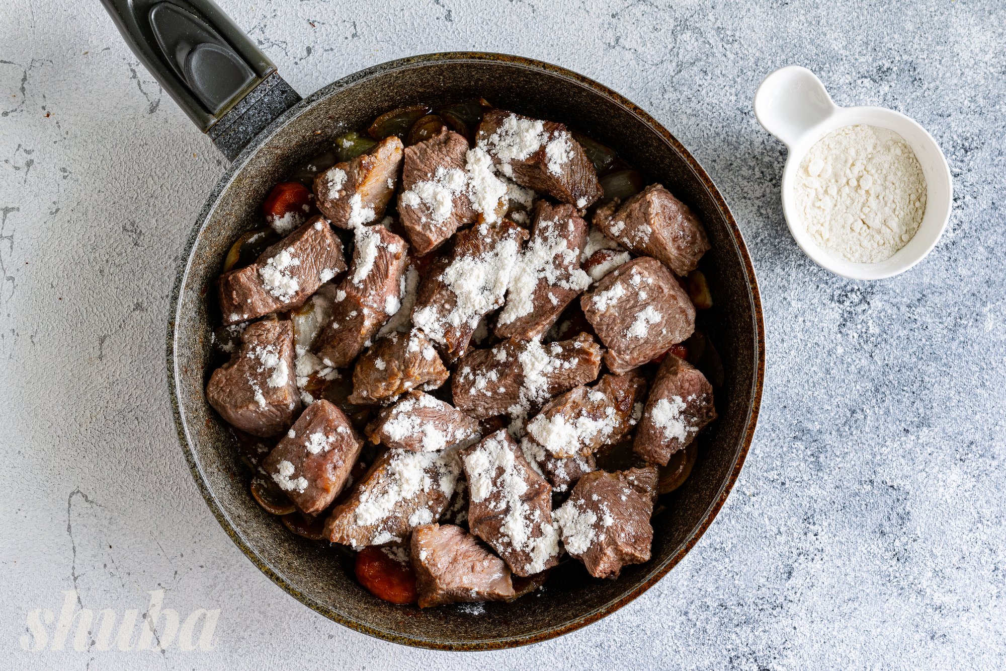 Переклади до овочів обсмажену яловичину разом із соком, який вона виділила. Посип шматочки м’яса пшеничним борошном, воно допоможе загустити соус. Перемішай інгредієнти.