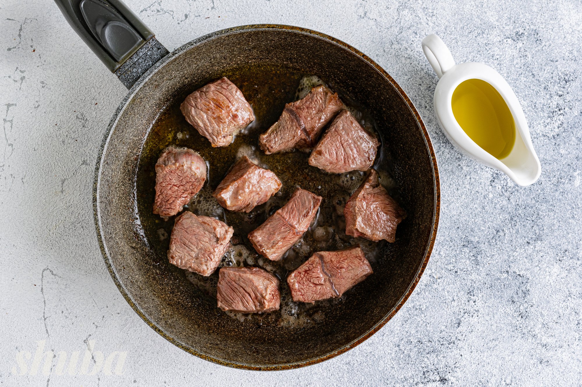 На сковороду з розігрітою оливковою олією виклади половину шматочків яловичини. Обсмаж м’ясо на сильному вогні до золотистої скоринки з усіх боків. Готуй яловичину невеликими порціями, щоб вона смажилася, а не тушкувалася у власному соку. Потім так само обсмаж другу половину м’яса. На цьому етапі не потрібно доводити м’ясо до готовності, потрібно лише запечатати всі соки всередині. Переклади обсмажену яловичину в окремий посуд, накрий кришкою та зберігай у теплі.