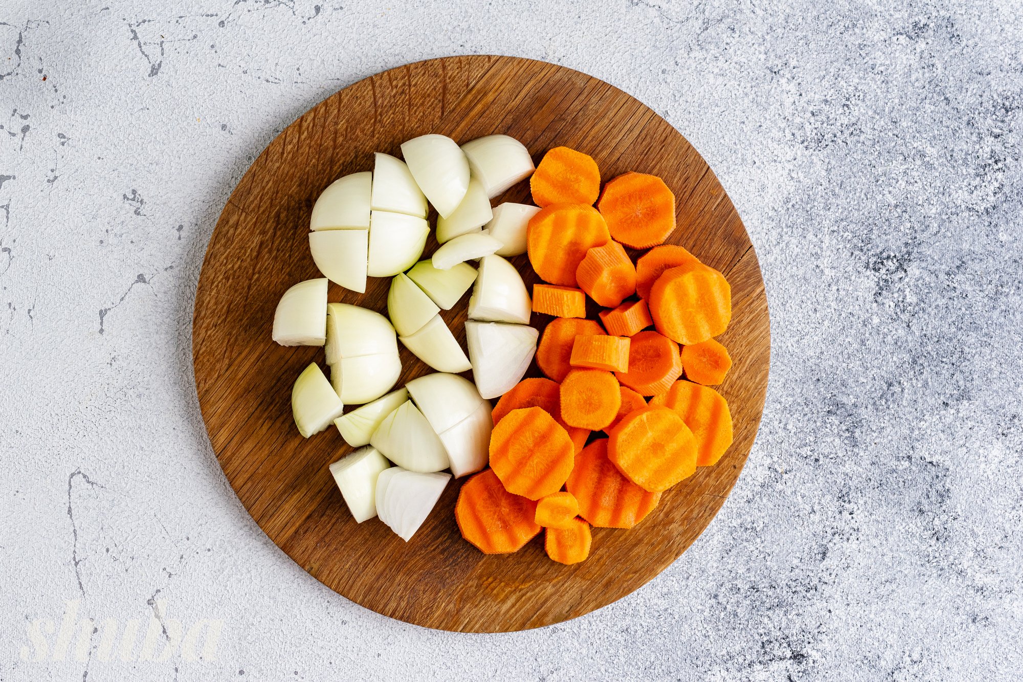 Ріпчасту цибулю очисти від лушпиння, наріж крупними шматочками. Моркву помий, очисти від шкірки, наріж кільцями товщиною 1 см за допомогою фігурного ножа.