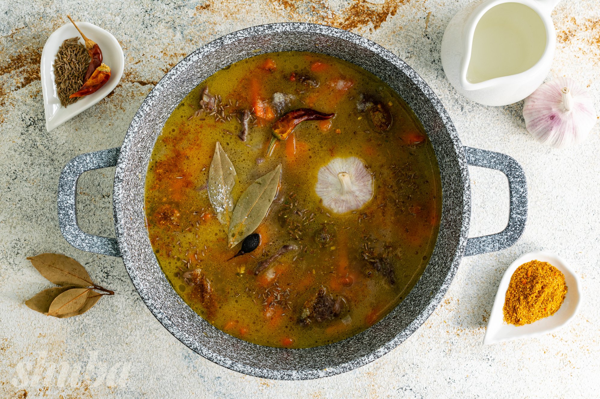 Виклади в каструлю цілу голівку часнику, очищену від верхнього лушпиння. Додай сіль, спеції для плову, зіру, барбарис, лавровий лист та гострий перець за смаком. Залий інгредієнти гарячою водою так, щоб м’ясо з овочами було повністю покрите. Накрий каструлю кришкою, тушкуй інгредієнти на повільному вогні 45-50 хвилин до м’якості м’яса.