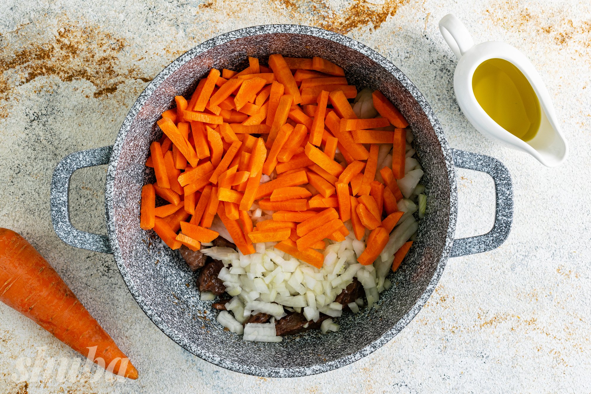 Очищену моркву наріж соломкою, додай у каструлю слідом за цибулею.