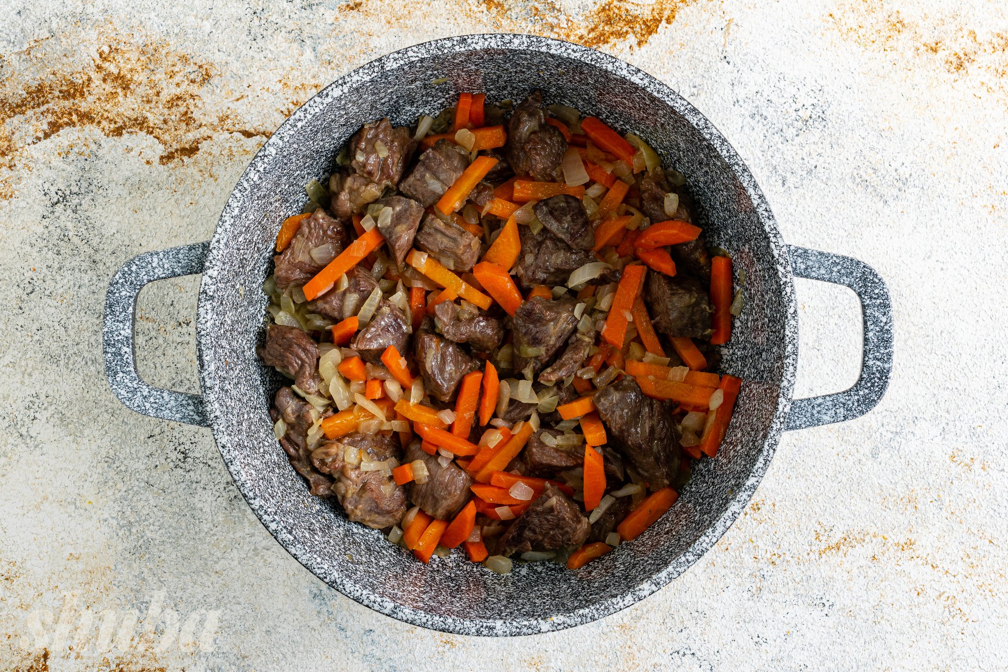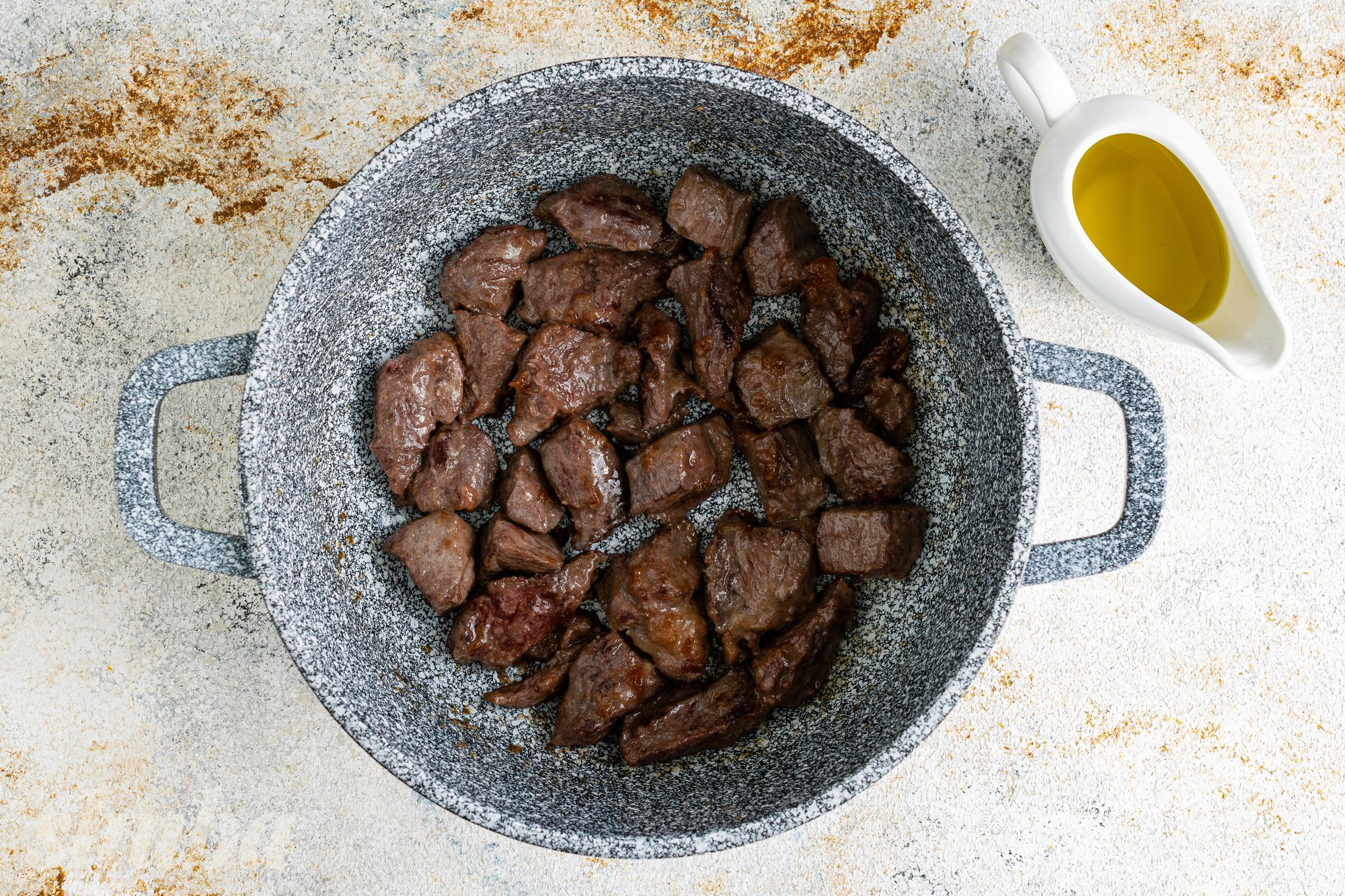 Виклади шматочки яловичини в каструлю з розігрітою олією. Періодично помішуй, обсмаж м’ясо на сильному вогні до золотистої скоринки з усіх боків. Таким чином всі м’ясні соки запечатаються всередині шматочків яловичини і м’ясо збереже свою соковитість.