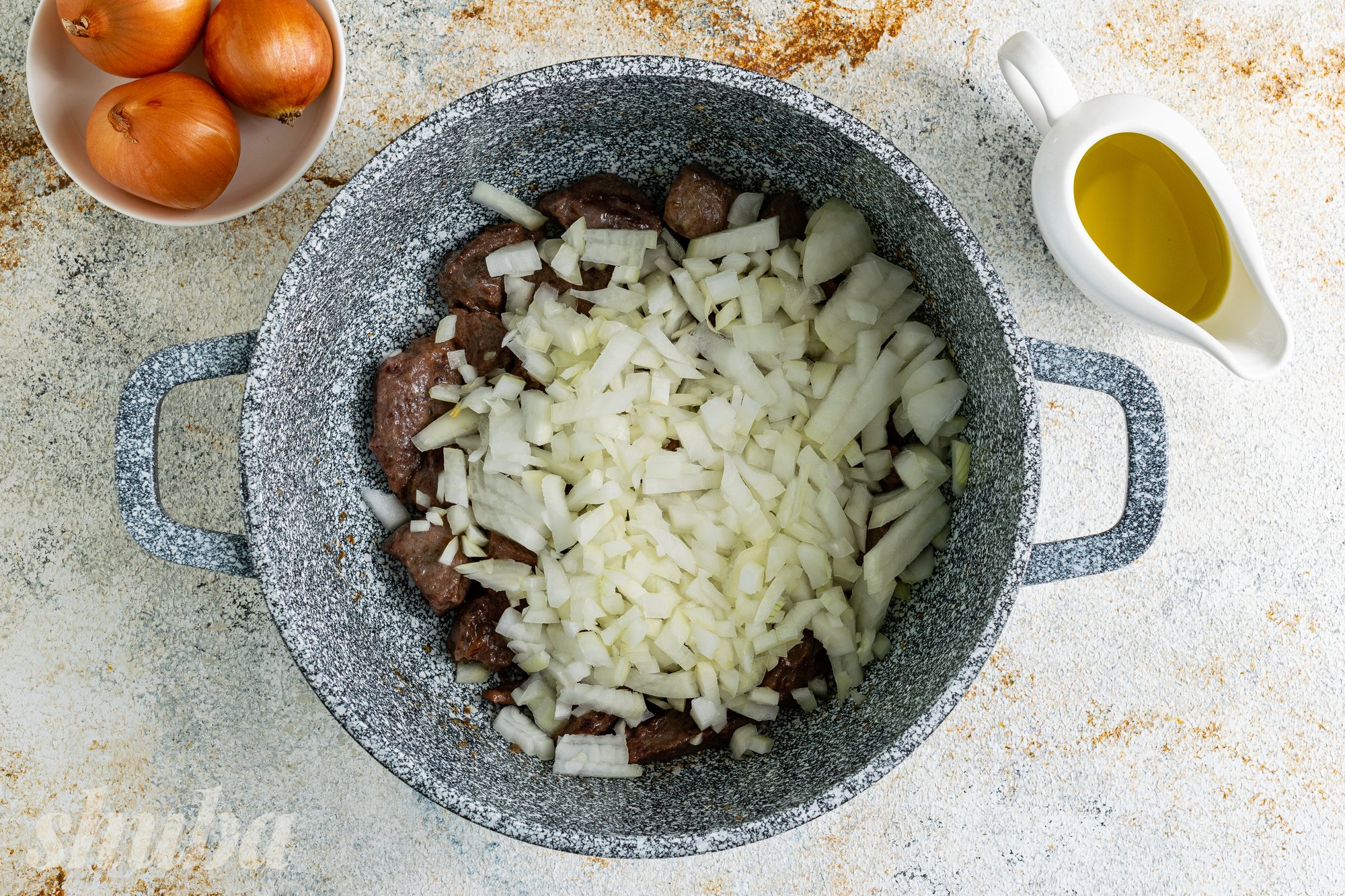 Очисти ріпчасту цибулю від лушпиння, наріж дрібним кубиком, виклади в каструлю з обсмаженим м’ясом.