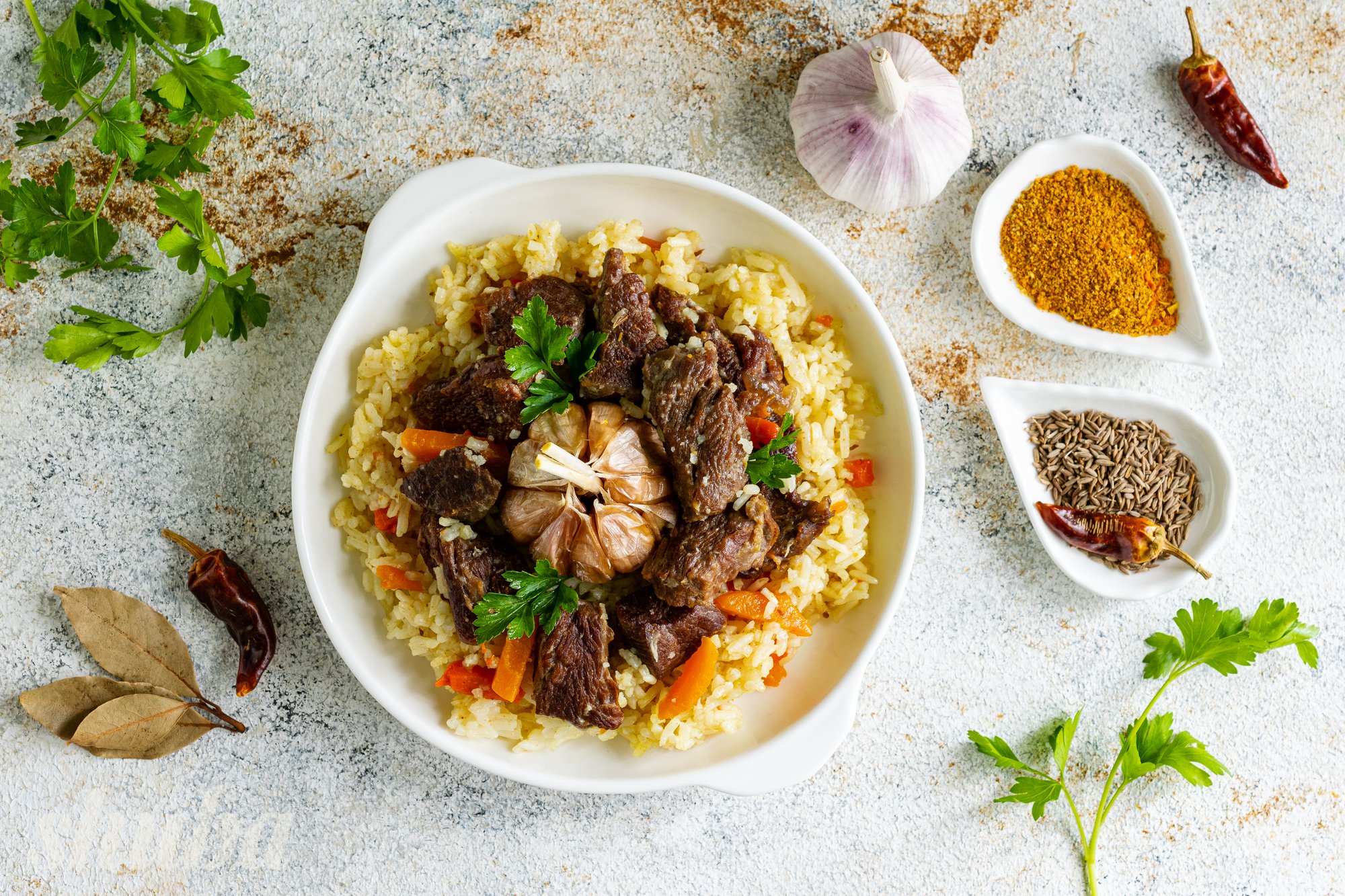 Для плову найкраще підходять частини яловичини, які залишаються соковитими після тушкування та дають насичений смак. Тому грудинка, лопатка чи шия вважаються найвдалішими. Спеції для плову відіграють ключову роль, саме вони надають страві той відомий східний аромат. Ідеально підійдуть зіра, барбарис, куркума, часник, червоний та чорний перець, коріандр та лавровий лист.