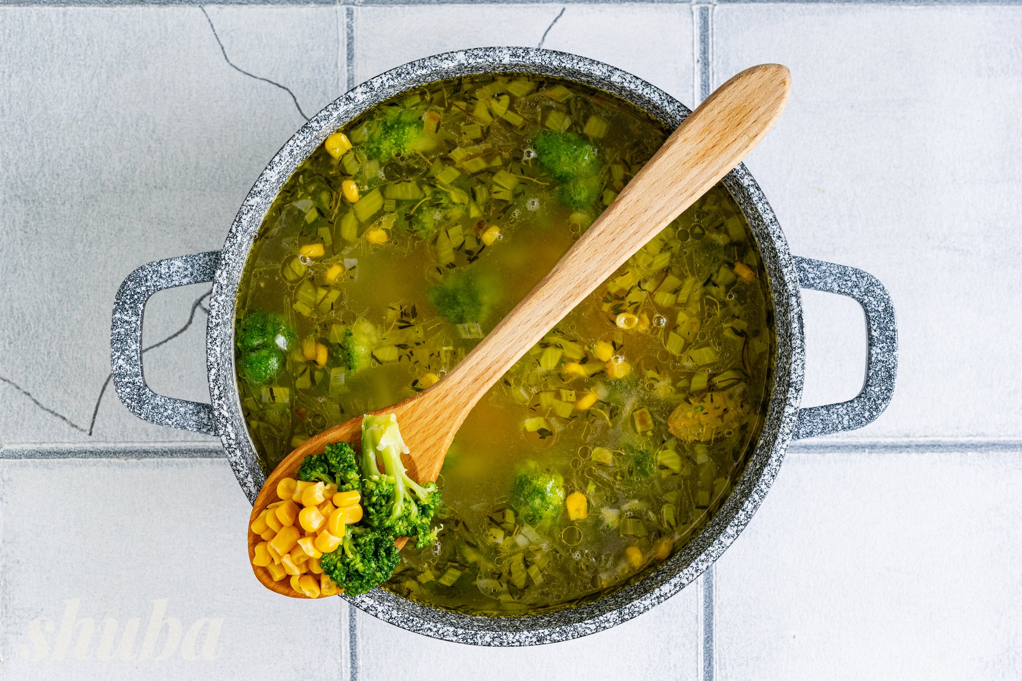 Опусти в каструлю заморожену чи консервовану кукурудзу і поділені на дрібні суцвіття броколі.
