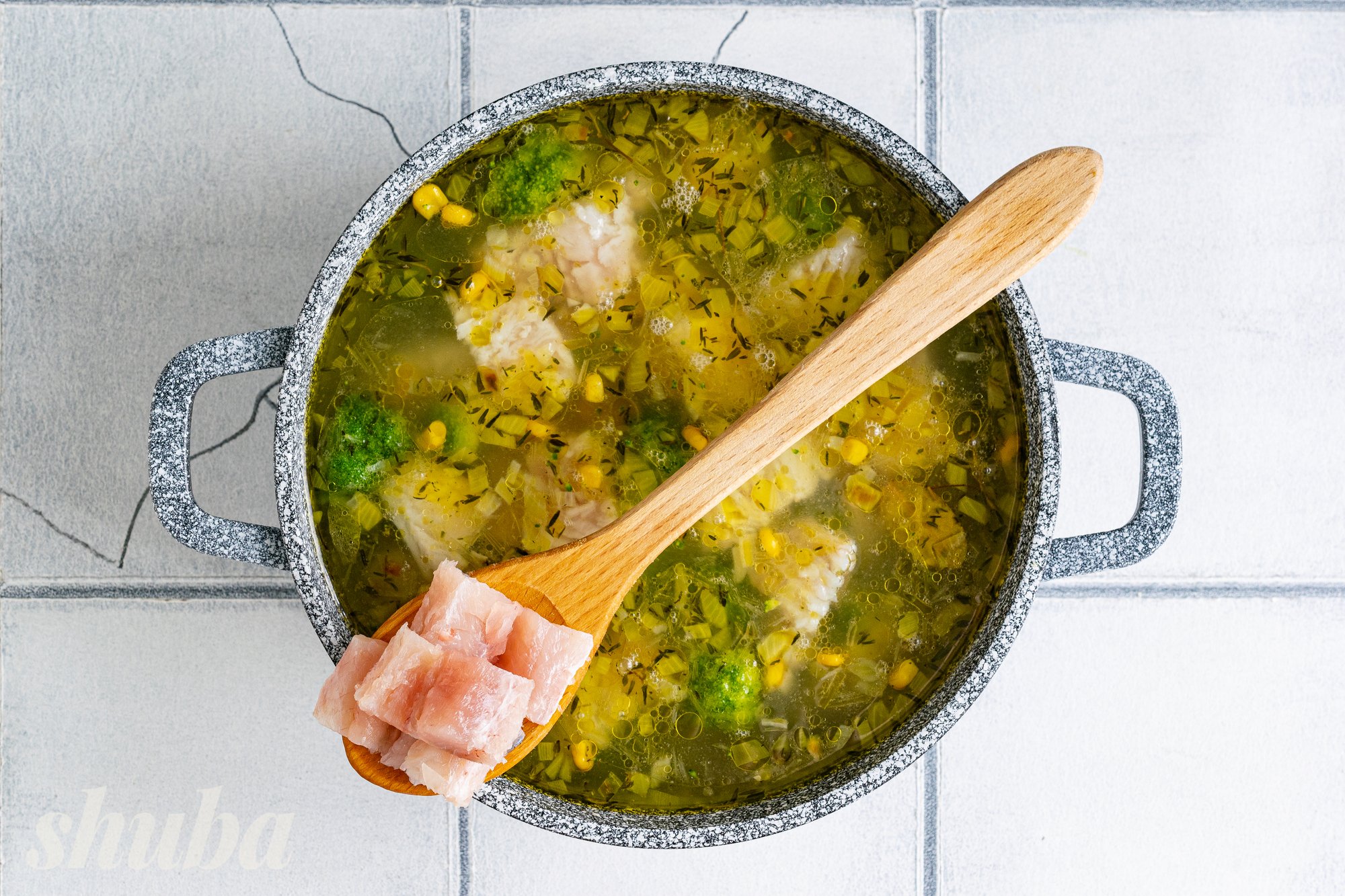 Наріж філе хека на шматочки середнього розміру, виклади їх у каструлю. Провари чаудер на повільному вогні 7-8 хвилин. Риба має стати ніжною і легко розділятися на волокна.