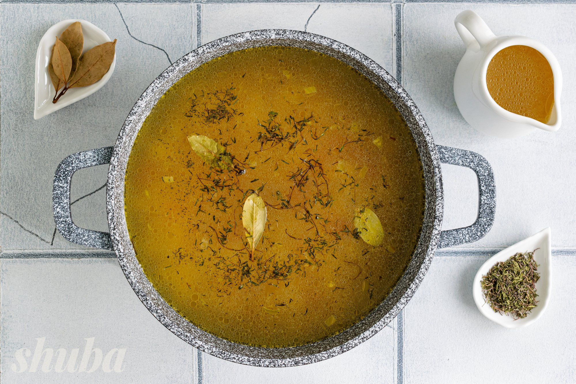 Залий овочі рибним чи овочевим бульйоном. Додай лавровий лист і чебрець, доведи до кипіння. Вари картоплю з овочами протягом 10 хвилин.