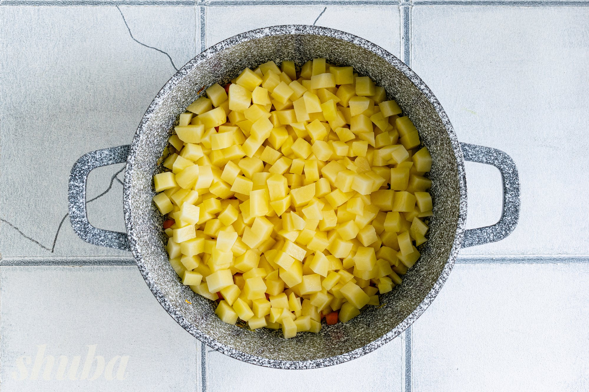 Картоплю помий, очисти від шкірки, наріж невеликими кубиками, виклади в каструлю.