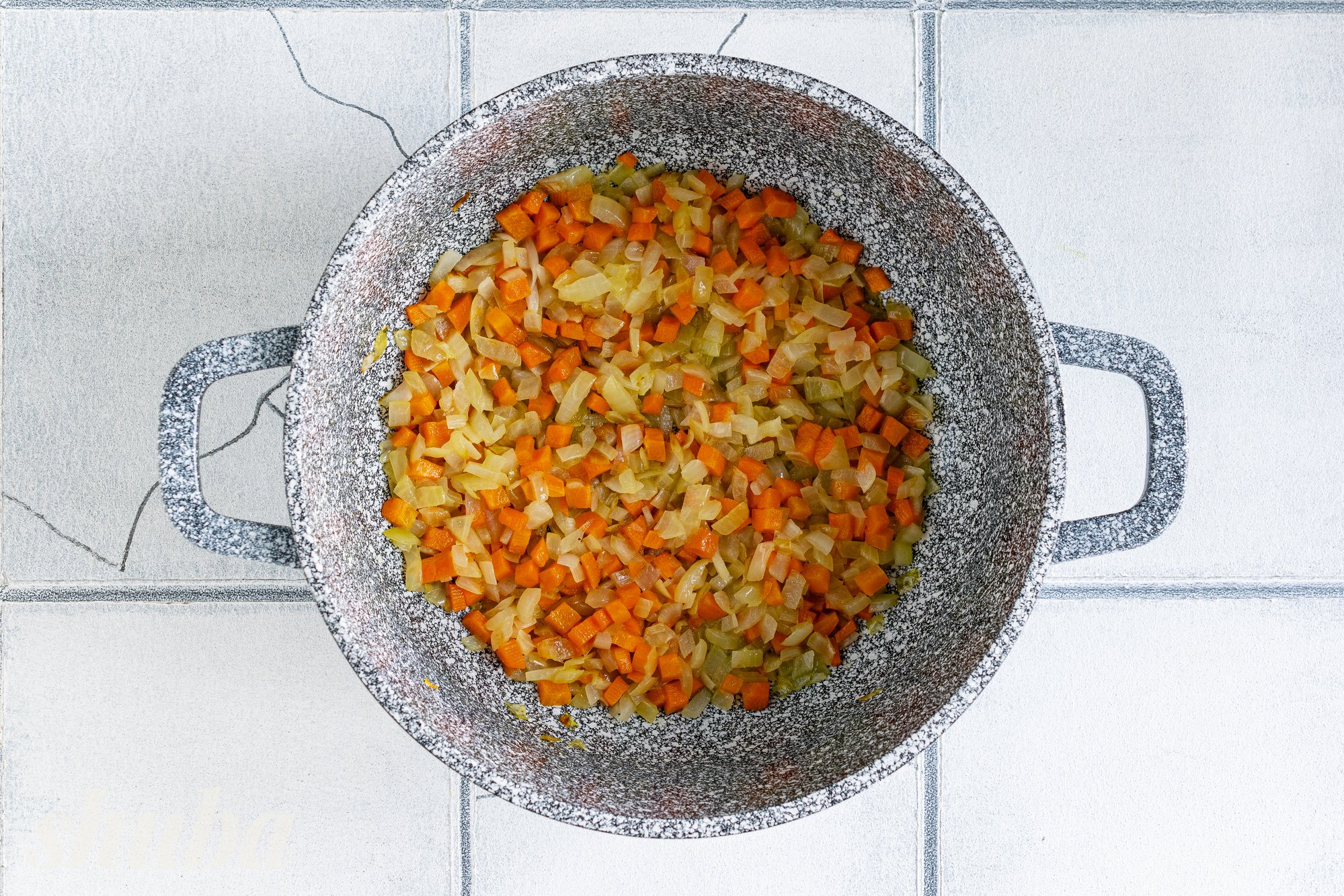 Ріпчасту цибулю та моркву наріж дрібними кубиками. Помішуй та обсмажуй овочі в каструлі на вершковому маслі до м’якості.