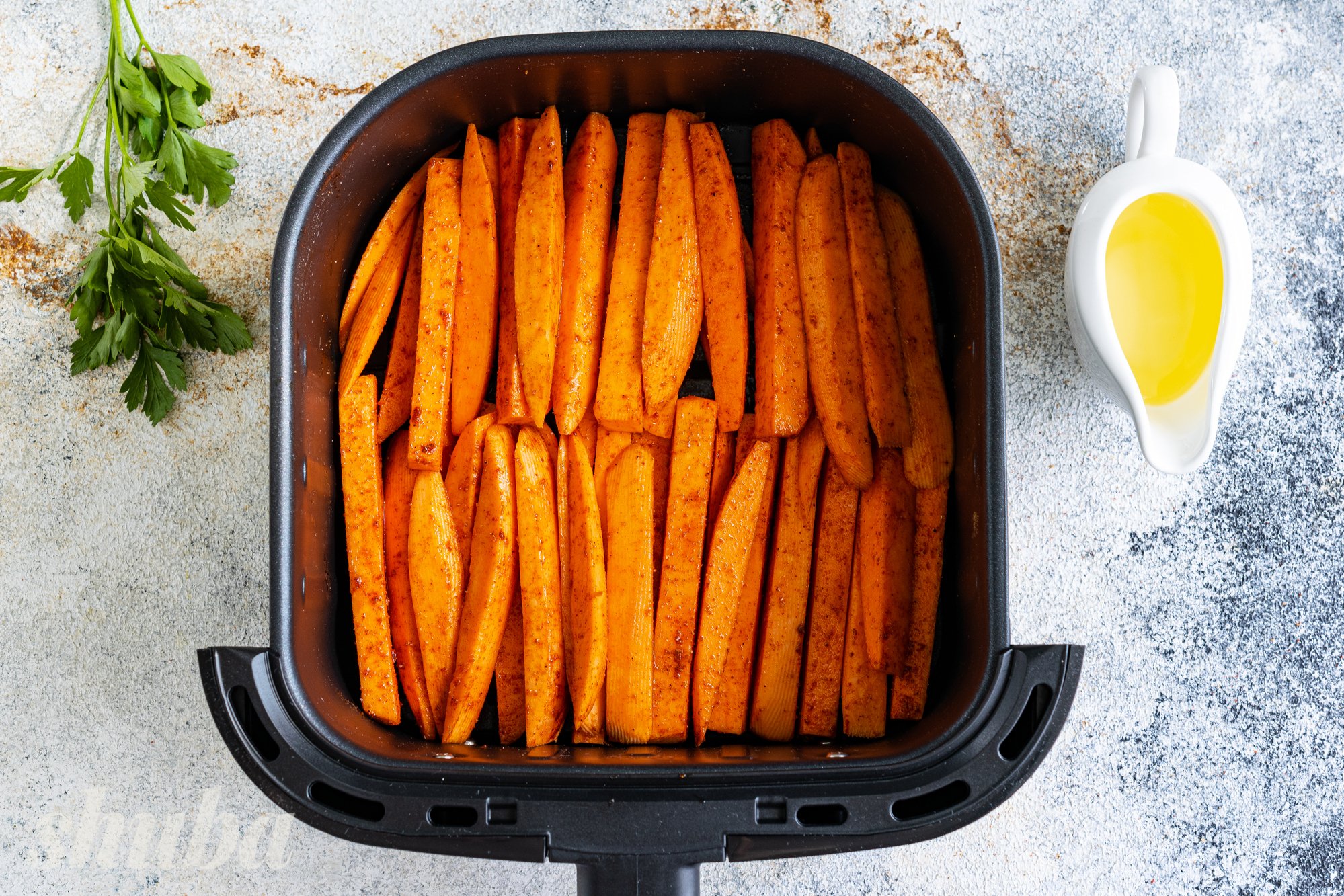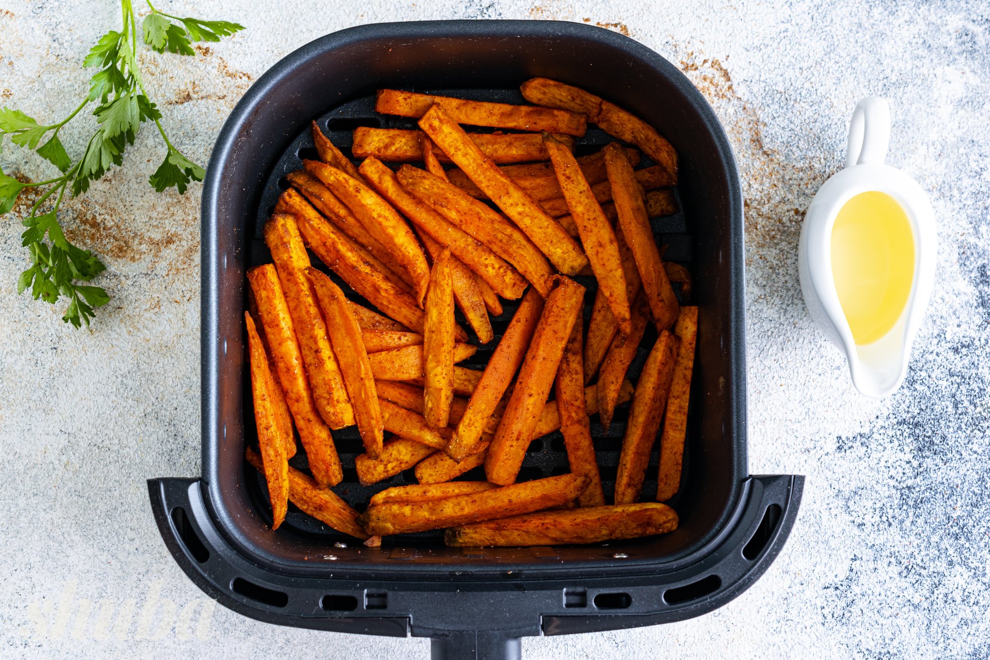 Запікай на програмі для приготування картоплі фрі. Вистав температуру 200 градусів, а час приготування — 15-18 хвилин. Усередині приготування перемішай, щоб батат приготувався рівномірно.