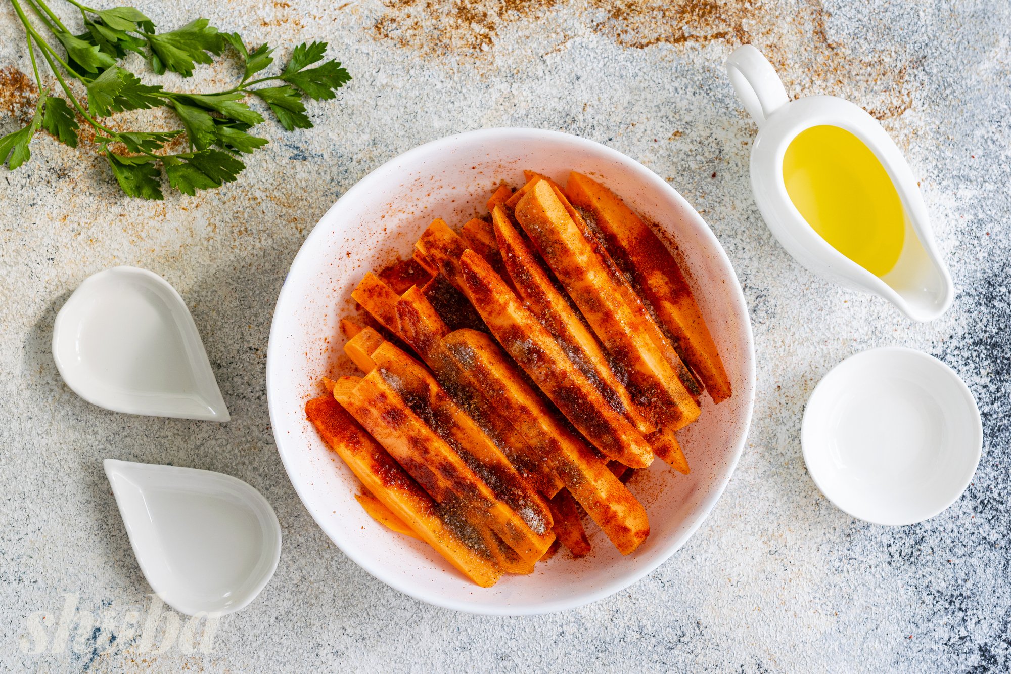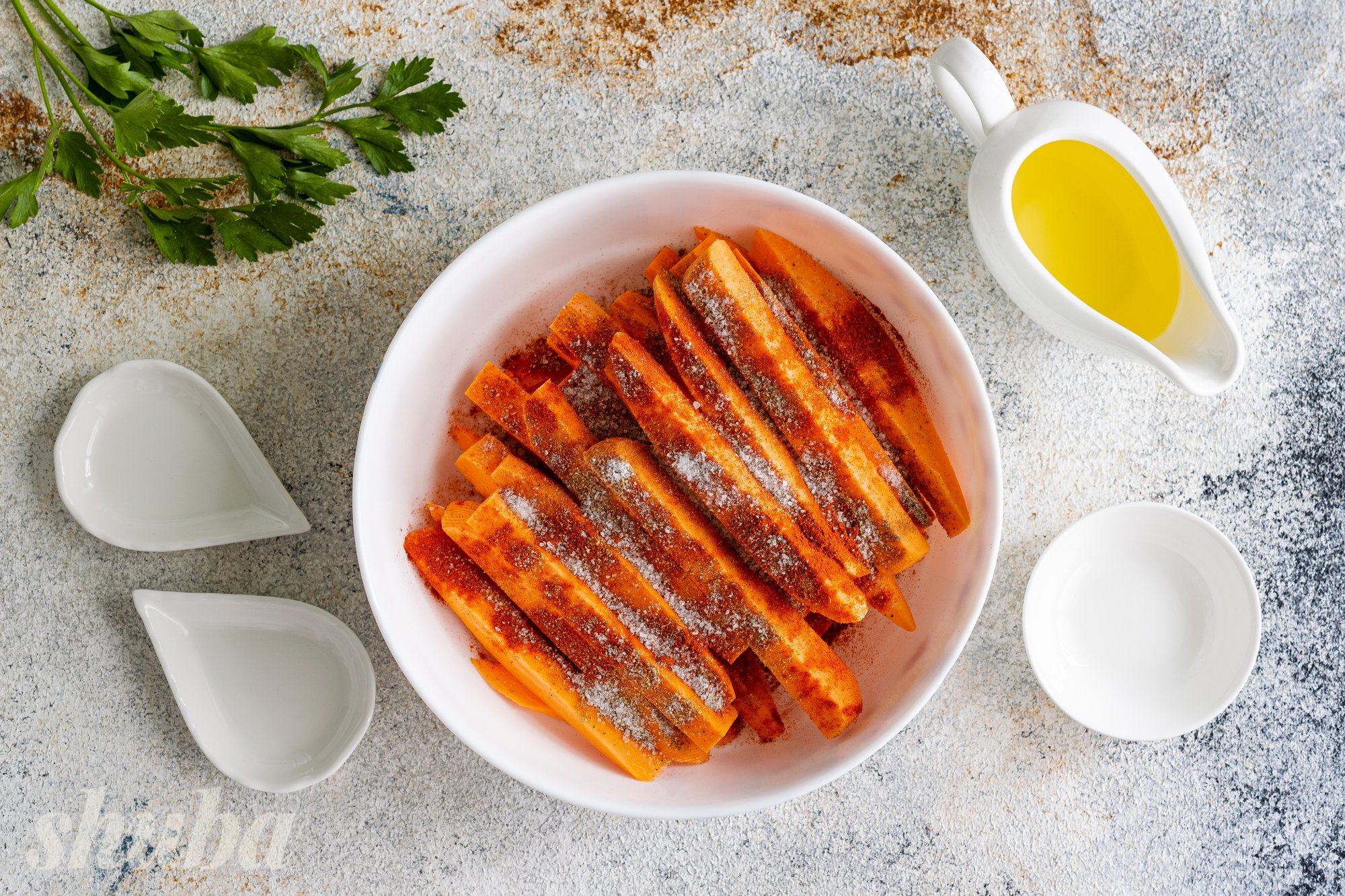 Якщо хочеш досягти особливо хрусткої скоринки, перед приготуванням замочи брусочки батату в холодній воді на 20-30 хвилин, а потім добре обсуши рушником.